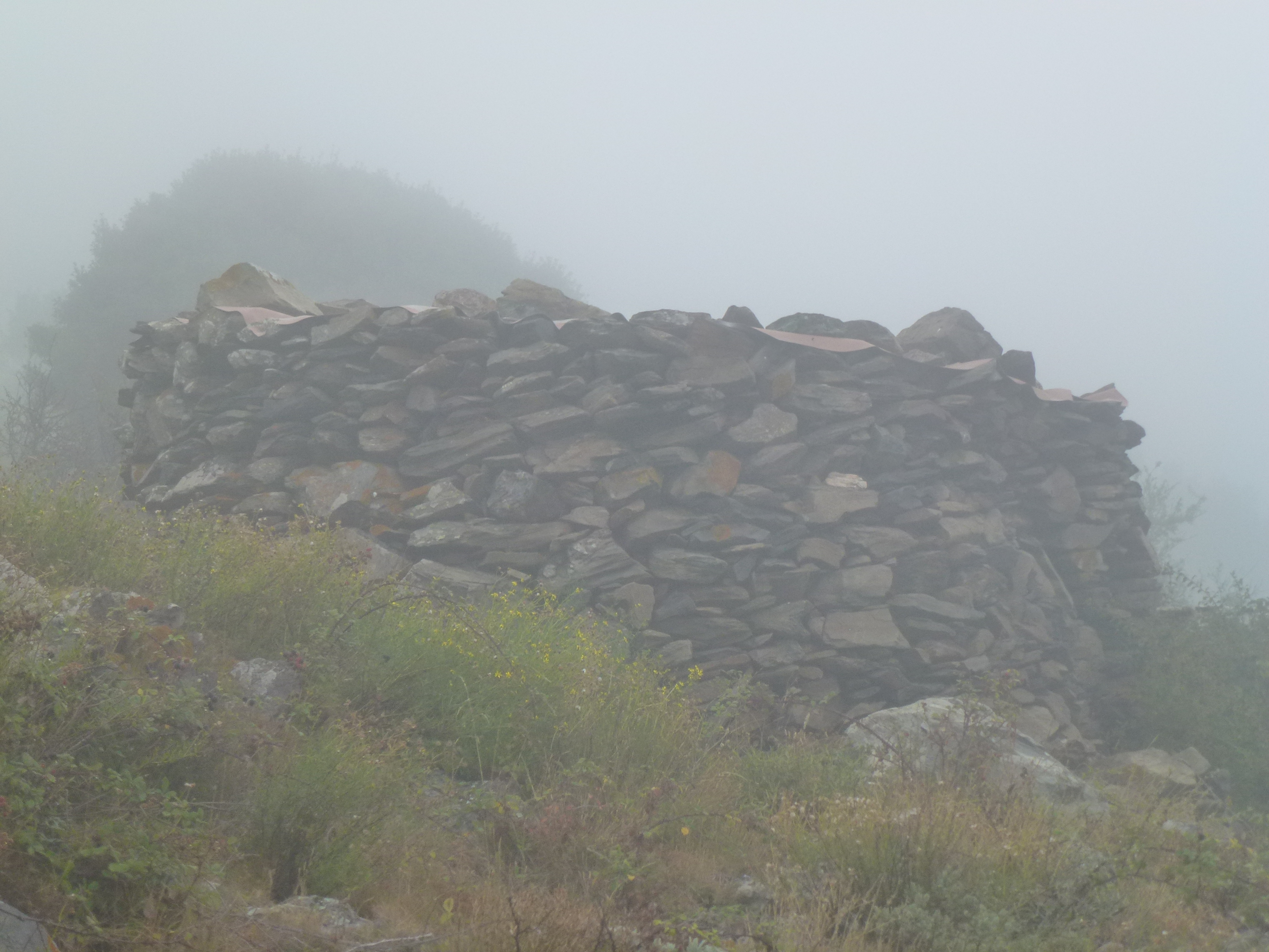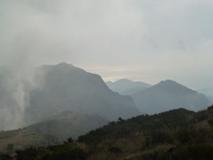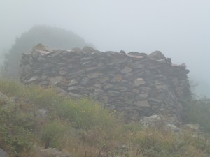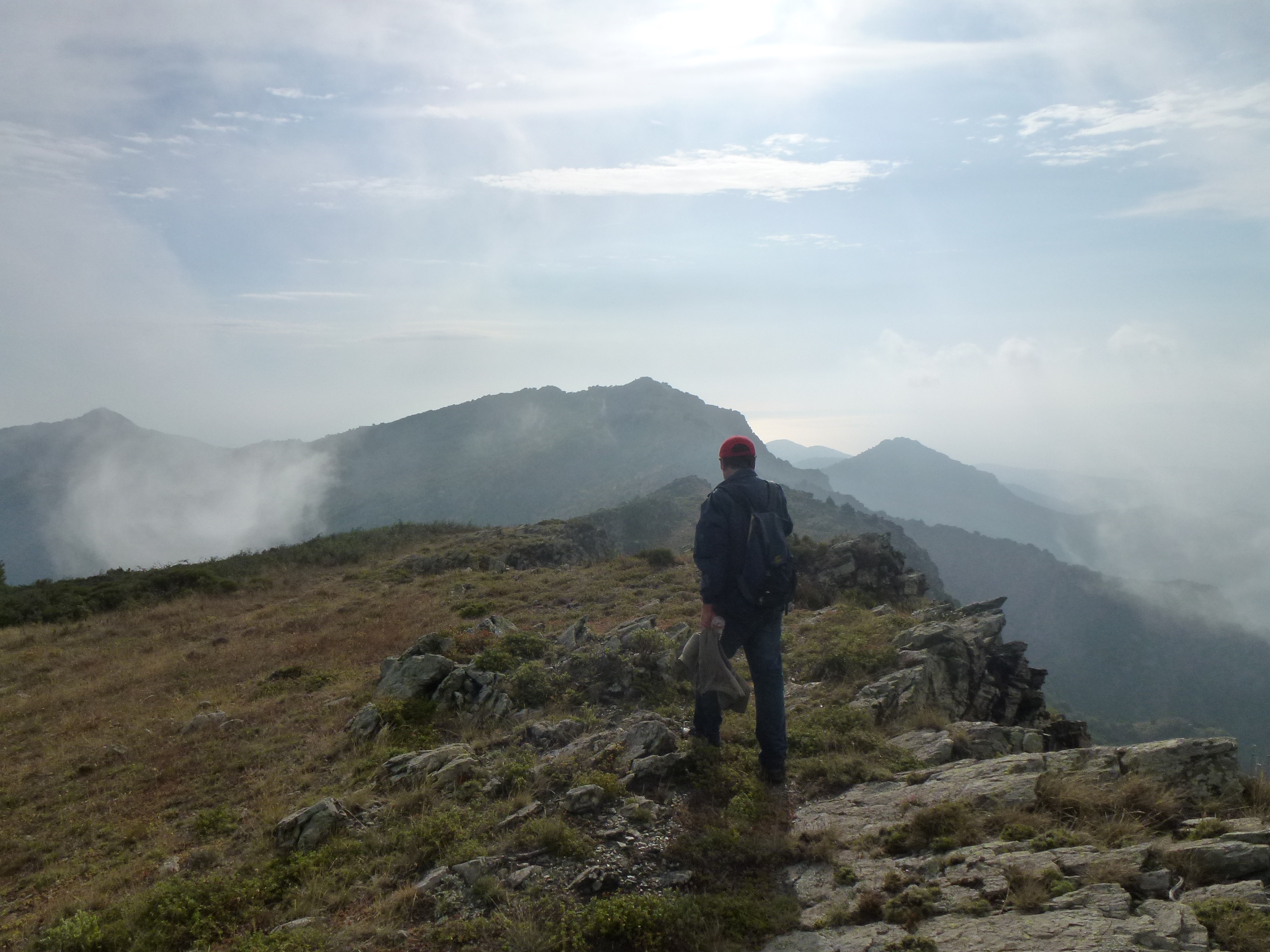 So, Joan, my daughter Sioned and I set off at 6.30, deposited at the monastery by Mrs Blanco, who has decided to sit this one out (on the beach, and somewhat later than 6.30), and we begin the calf-wrenching ascent to the first pass, Coll de Pallerols. Despite the mist, we arrive at the pass an hour later drenched in sweat, and I already feel as though I have spent an uninterrupted week in a Turkish bath, but having got this far there is no option but to press on. I keep wanting the mist to clear, as there are magnificent views across the peaks, and although the Alberas are small mountains compared with the Pyrenees of the interior, they are still dramatic in juxtaposition with the sea.
