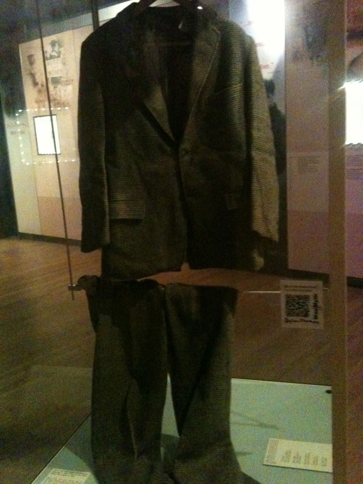 Finally, here – on display last week at the Dylan Thomas Centre in Swansea –  is a picture of the suit that Dylan was wearing in the last week of his life, presumably including the day that saw the downing of the famous 18 whiskies, or however many it was. Who, other than a complete wanker, would count the number of drinks he was downing? I was always suspicious of that story. Not that 18 whiskies is a lot, considering. Anyhow, apparently Dylan borrowed the suit off some fellow called Jorge Fick in the Chelsea Hotel before going off and dying in it. ‘Borrowing’ clothes was one of DT’s preferred activities. He was always ‘borrowing’ shirts after puking all over his own, and as for underwear etc, etc. An ex-girlfriend’s aunt used to go out with Clement Freud circa 1950 and they bumped into Dylan whilst queuing for the cinema in Soho. Dylan, whom they knew slightly, tried to blag the price of a seat from them but they didn’t have enough money. On another occasion, turning up at an acquaintance’s house to bum money/drinks/smokes, Dylan was answered at the door by the owner, who said ‘Sorry, we’re entertaining.’ ‘Not very’, quipped Dylan. Boom boom.