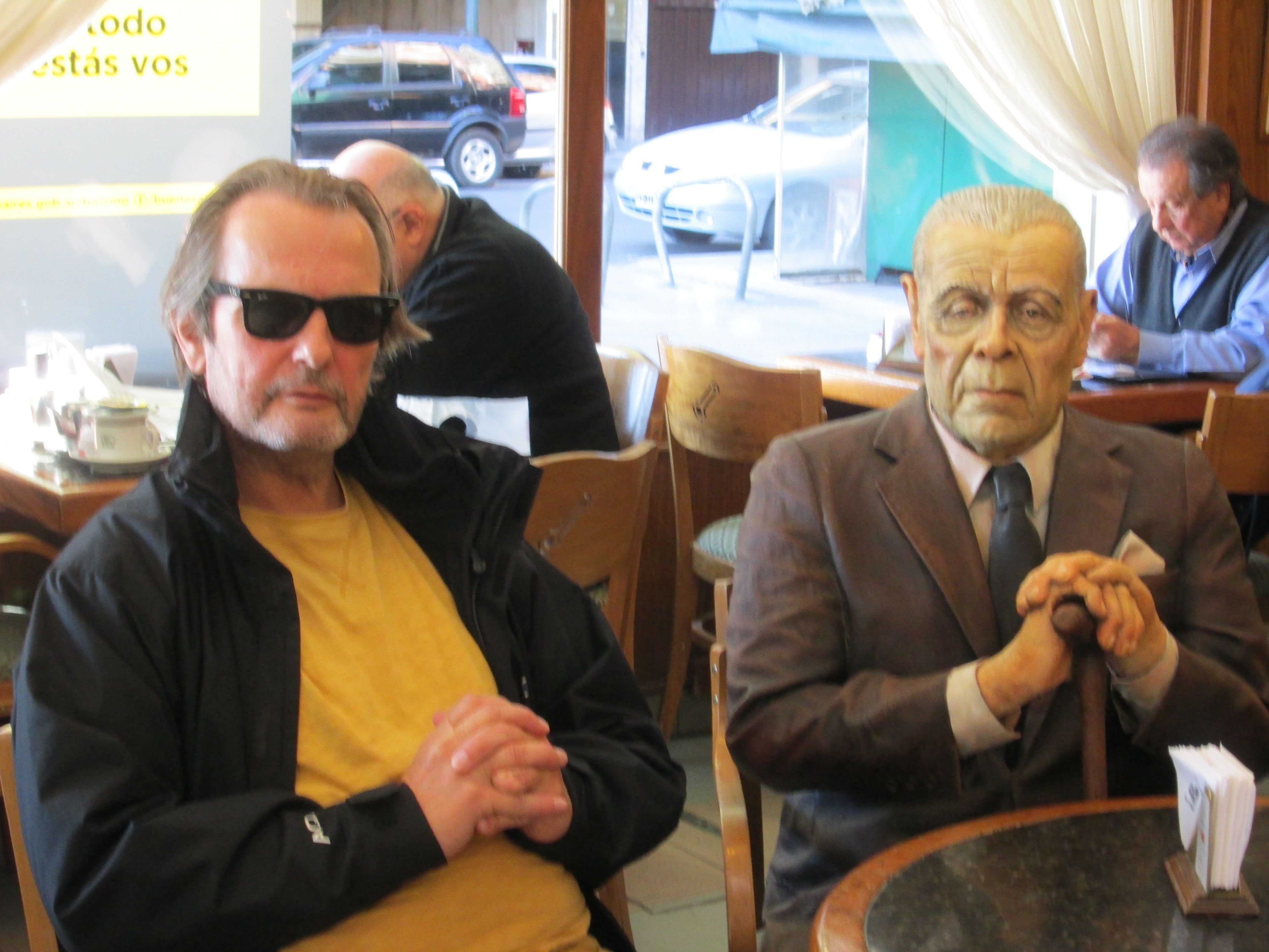 Blanco working undercover as a wax model, with a simulacrum of Famous Argentine author in La Biela Café, Buenos Aires.