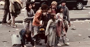 When a fire breaks out, the surviving blind escape into a world which is now utterly sunk into ruin and desperation. Led by the doctor’s wife, the group wander through the city, in a fashion reminiscent of those World War One film clips, in which the victims of a poison gas attack shuffle forward, each with his hands on the shoulder of the one in front. Finding refuge in an empty shop, the doctor’s wife leaves the others behind and goes in search of food. Most of the stores have been looted, but in the underground storeroom of one supermarket, she stocks up on chorizo sausage, black bread and water. Driven by hunger, she takes a few bites of the sausage. In the frantic passage that follows, she starts back through the supermarket, three shopping bags slung over each arm, and the blind, though they cannot see her, smell the goods she is carrying, ‘and in no time a blind man was shouting Who’s eating sausage around here’. The doctor’s wife is mauled by the grasping arms of the blind, and she ‘broke into flight, colliding, jostling, knocking people over, with a devil-may-care attitude that was wholly reprehensible, for this is not the way to treat blind people who have more than enough reason to be unhappy’, and is pursued breathless and stumbling out into the street, out into the pouring rain, where the scent of sausage now attracts a pack of feral dogs, who, however, soon disband (the streets, after all, provide enough cadavers to keep them going) save one, which licks her face, licks her tears away, and which she befriends after collapsing in rage and terror at the side of the road.