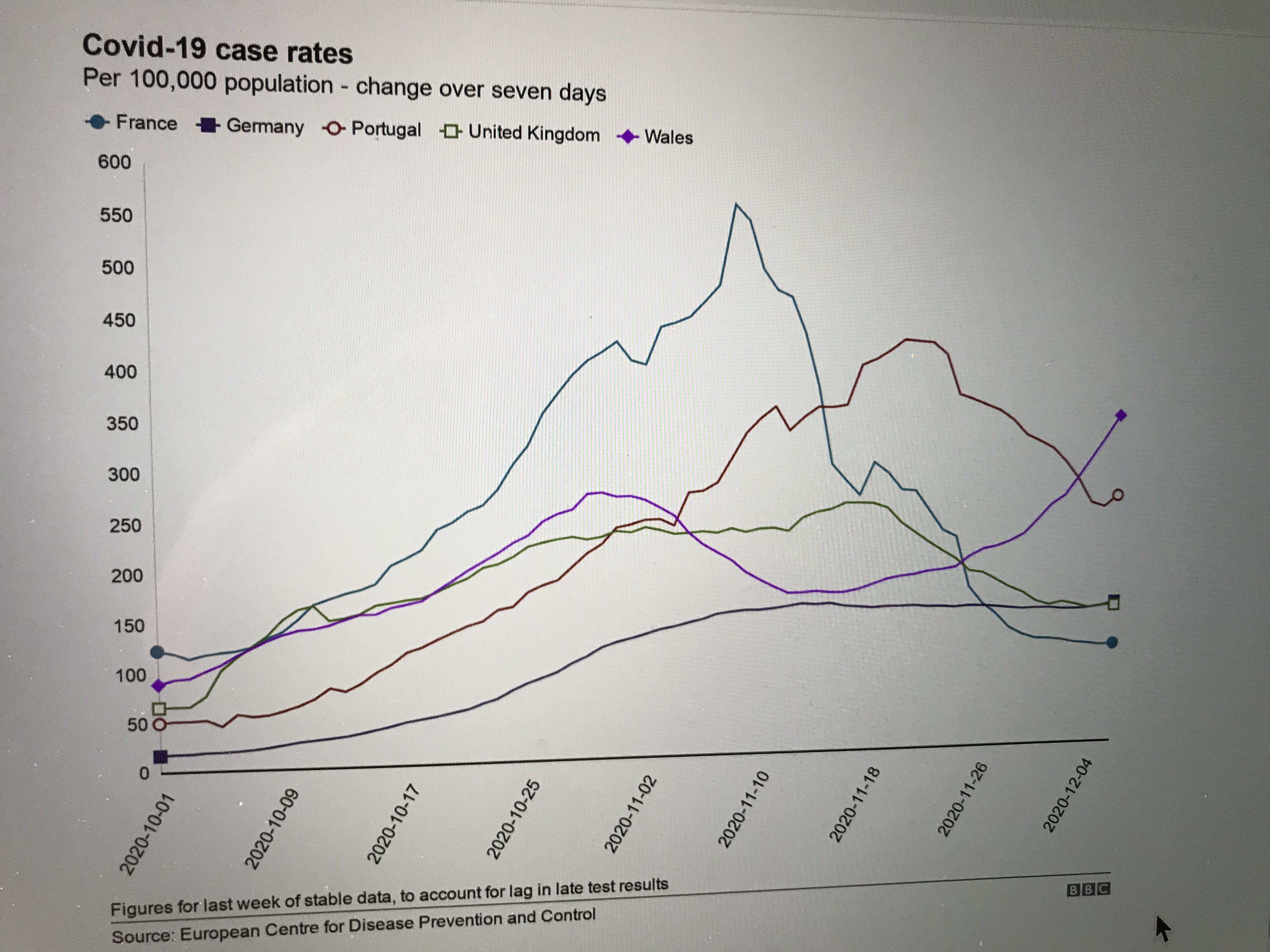 Cons were: (a) we would have to follow quarantine rules, despite moving from a place with no COVID to an area with more COVID per head of population than anywhere else in Europe — see diagram below indicating COVID rates in Wales as compared with UK and Europe, BBC Wales 14 December, 2020; (b) we would almost certainly have to go into a further period of lockdown — there seems to be a glorious indifference to safety here in the UK and, unlike in Spain, face masks are a rarity except inside shops and offices — which, inevitably, occurred just as we were emerging from quarantine; (c) we would, as a consequence of (b) be restricted to taking exercise and walking our aged dog, Bruno, in a city park near our house. But I don’t want to whinge . . . millions of people have it far, far worse than us. At least we have a roof over our heads, food, a warm house, a loving family . . .