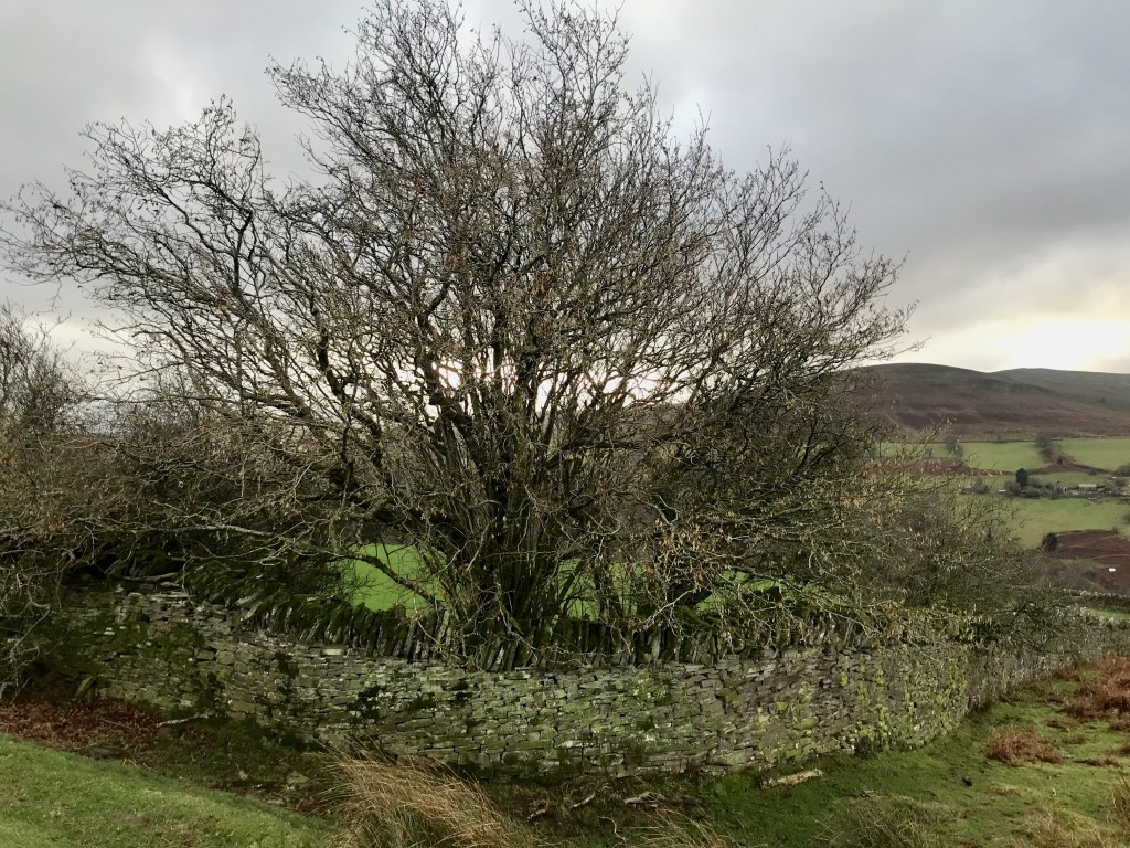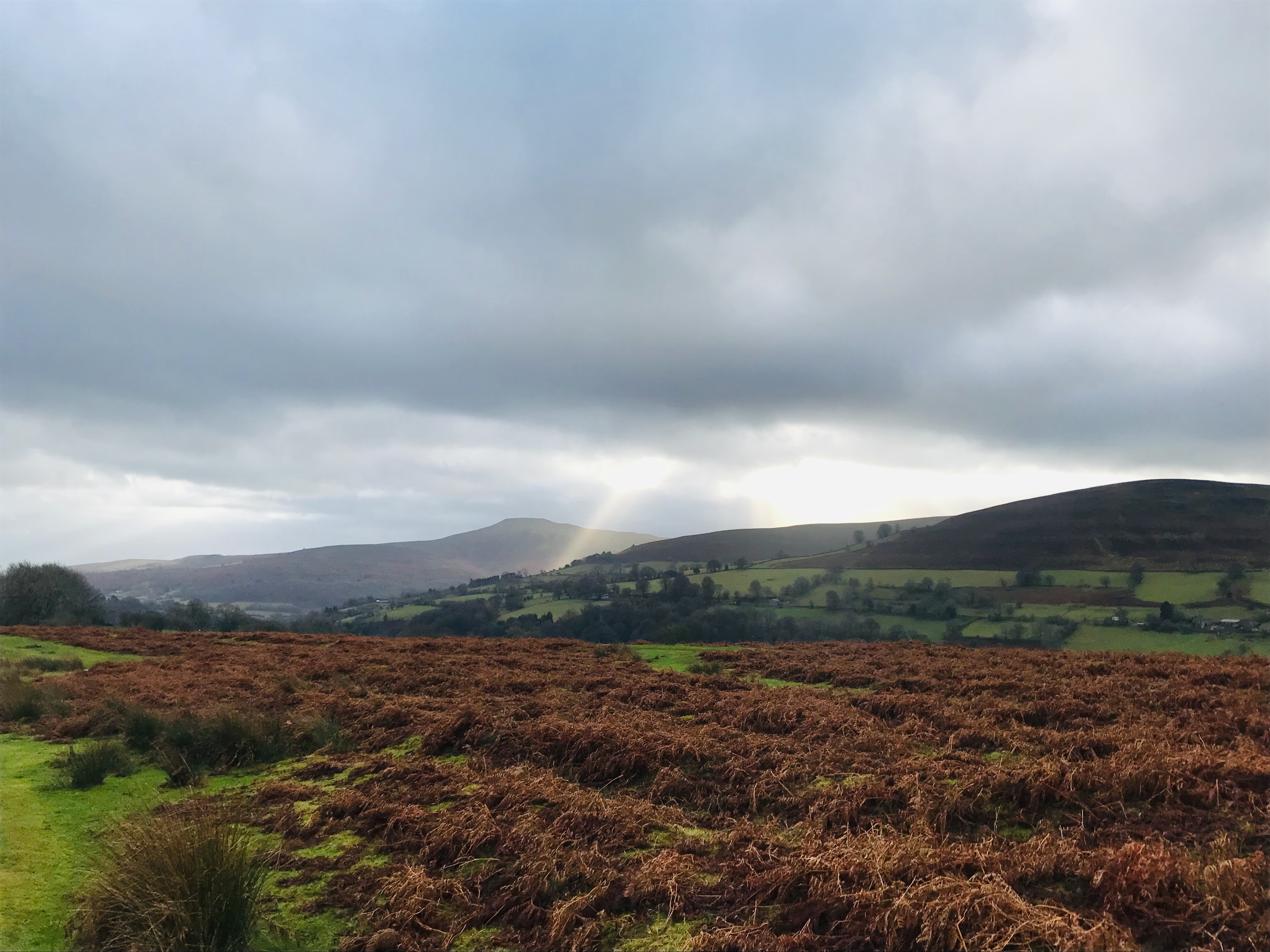 On New Year’s Eve we climb the Ffwyddog ridge, that separates the valley of Grwyne Fawr from the Vale of Ewyas. It is warm for the time of year, but not so warm, nor so dry that we do not need extra layers and raincoats. The sun makes an effort to break through layers of cumulus, but to little avail. Once there is the glimmer of a rainbow, but the particles that form it dissolve almost as quickly as they assemble, or more correctly speaking, we are standing in the wrong place to see it. Everything is in motion; everything is a part of the spiral.