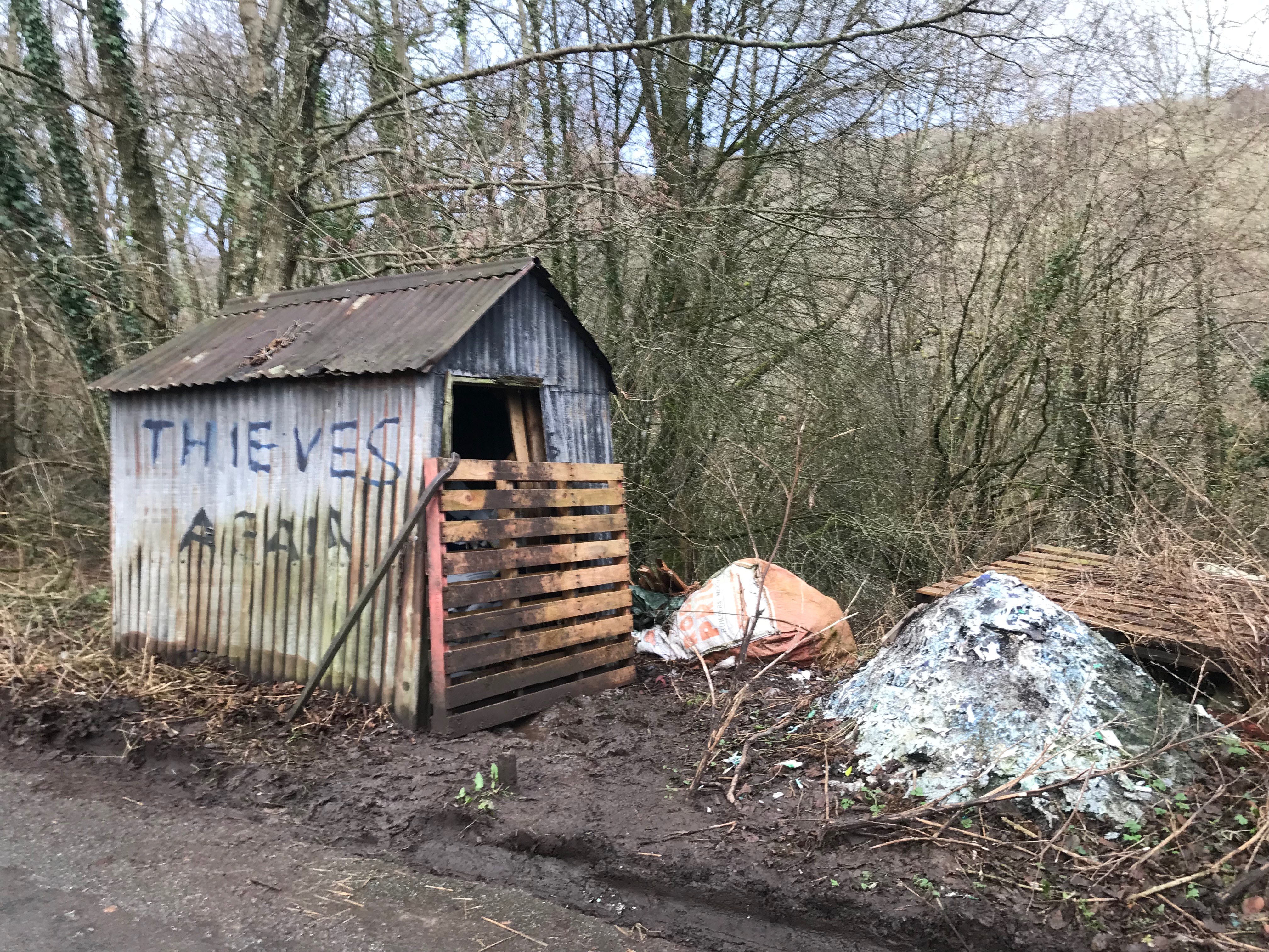 Following the lane back down the Grwyne Fawr valley, we pass a corrugated iron shed, on one side of which are the words BEWARE DOG, and on the other, in the photo, THIEVES AGAIN. This message could be read in several ways.