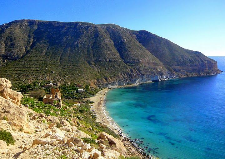 Las Perdidas, it transpires, is way off the beaten track. The bus stops at a nearby town and we walk along an unsurfaced road for an hour before descending a narrow mule-path down the cliff face towards a jumble of stone cottages near the beach. Some of the buildings look as if they were deserted a century ago and are beyond repair, but others even have roofs, and a semi-permanent settlement of hippies or friquis live in the more robust houses, which are perched at a slight elevation, overlooking the sea. These inhabitants have become accustomed to a drifting population occupying the lower, more ruinous houses, or sleeping rough on the beach, and pay us no attention as we file by, the six of us, carrying our possessions, sleeping bags or blankets, and several plastic containers filled with wine.