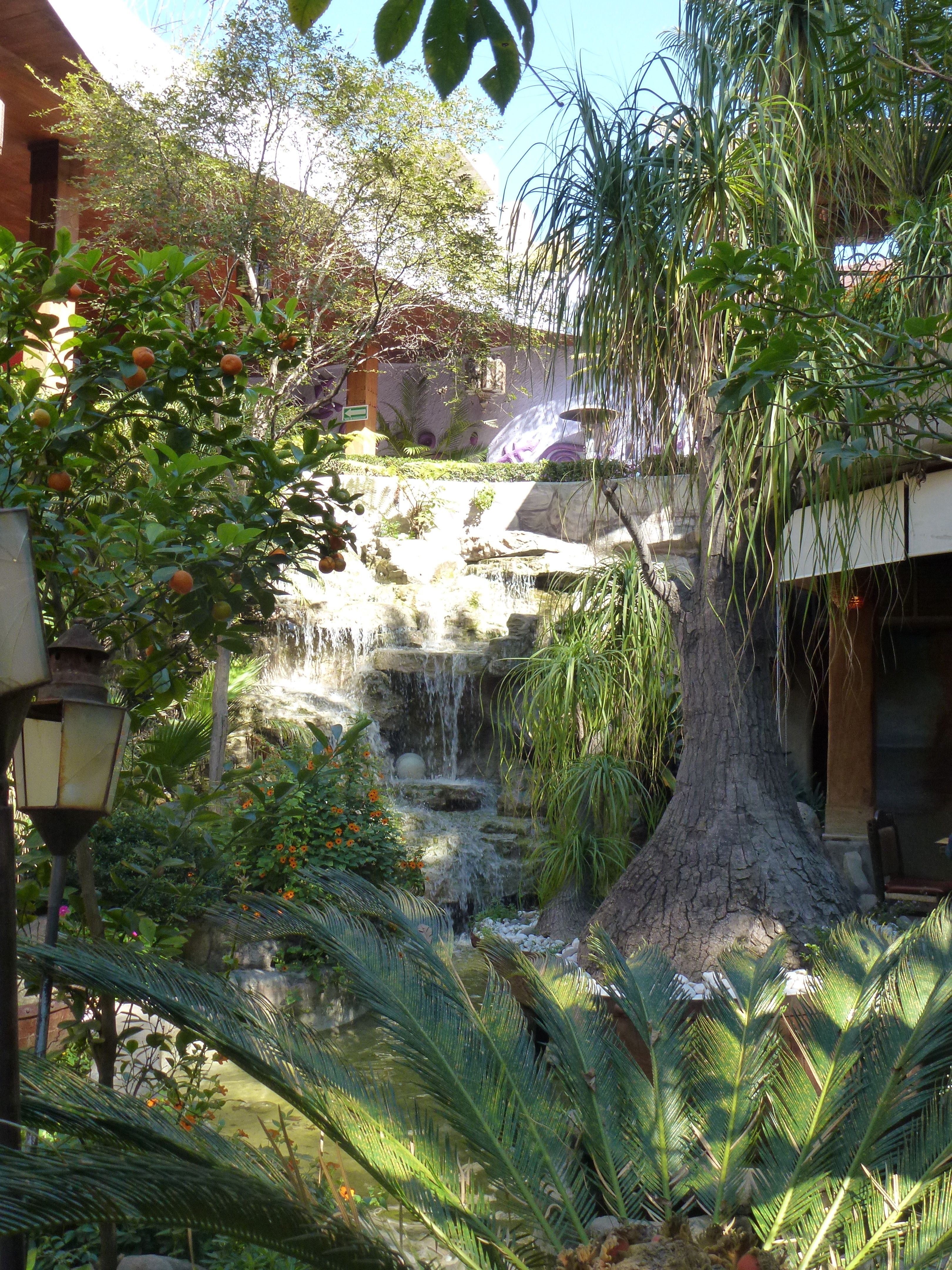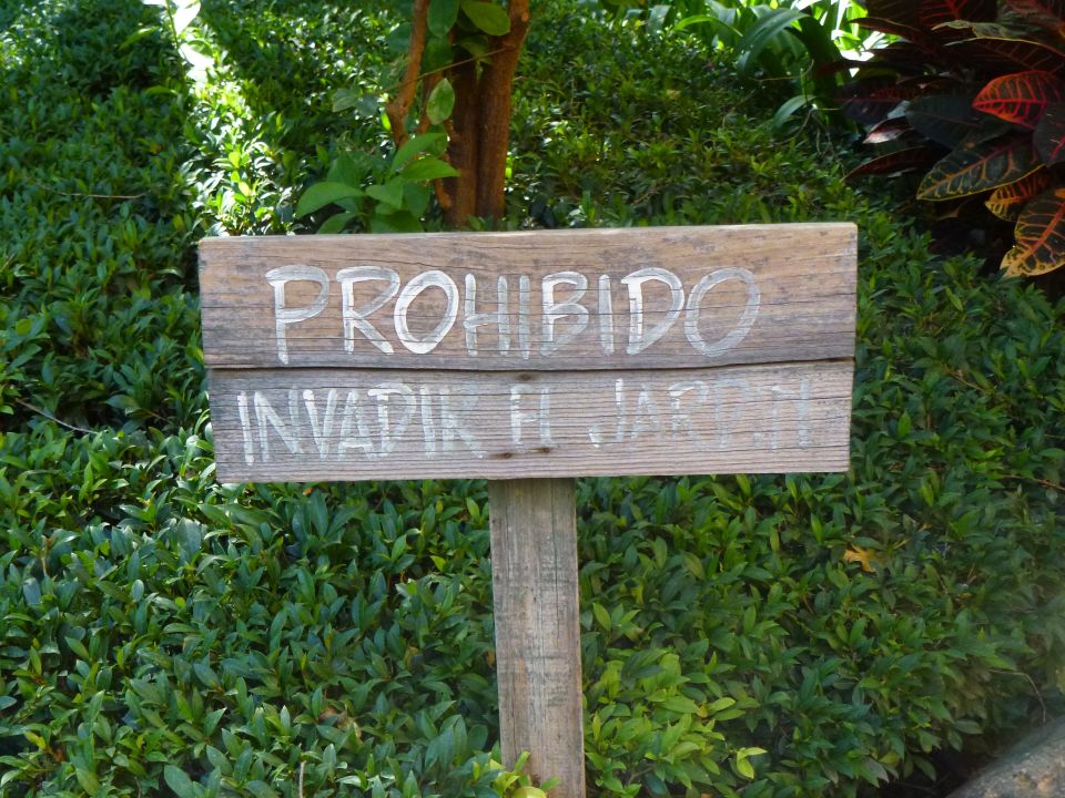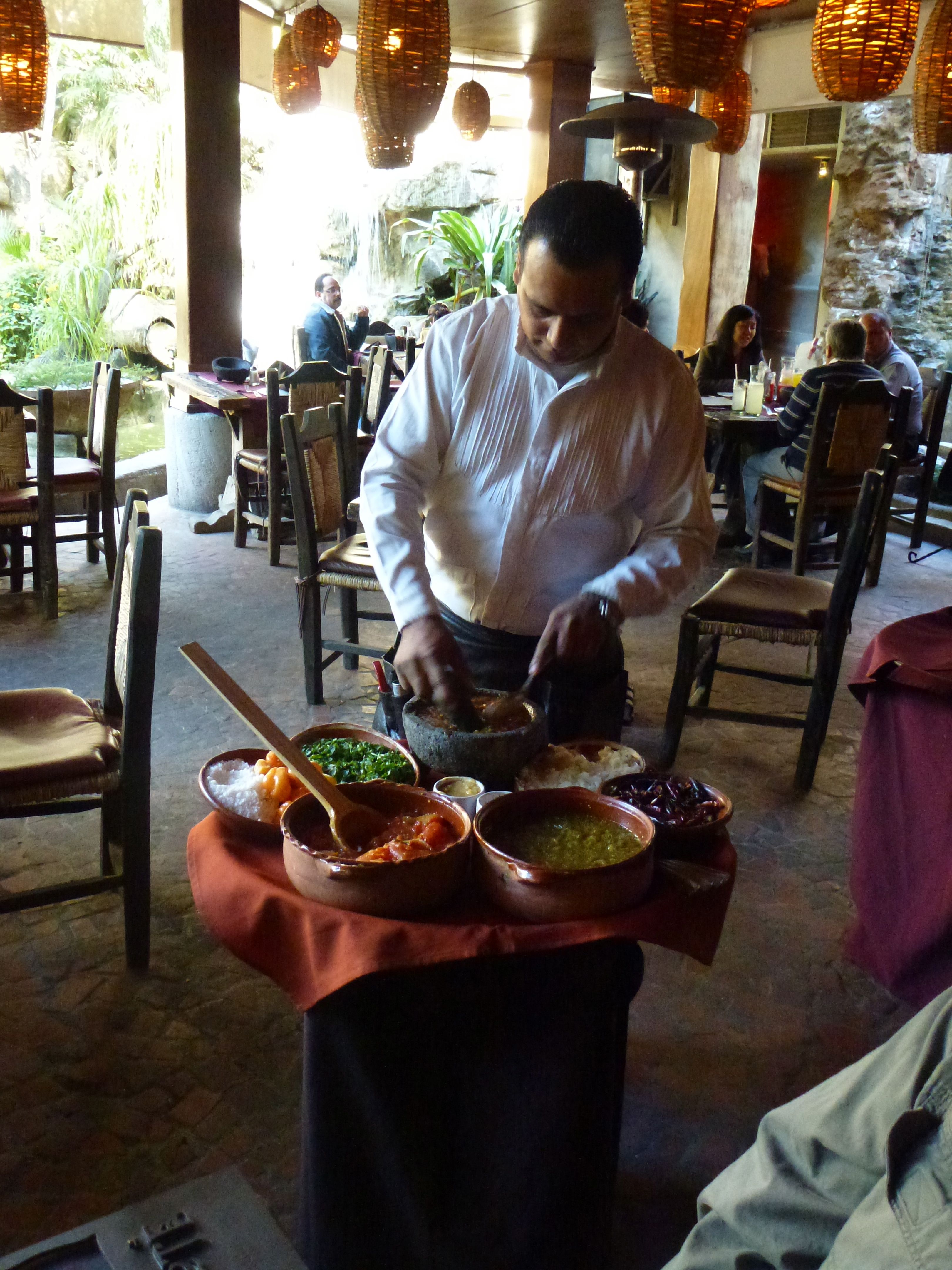 Today I was taken to lunch in El Santo Coyote restaurant, and in the shady garden (where, as usual, according to the sign, invasion is prohibited – please see my post from Montevideo on this recurrent theme) complete with waterfall, your man comes to the table with mortar and pestle made from volcanic rock and, after asking if you like your salsa hot or what, he begins to pummel it into shape before your eyes. With chilli, garlic, some variety of parsley, and then tomato. And hell, yes, it works.