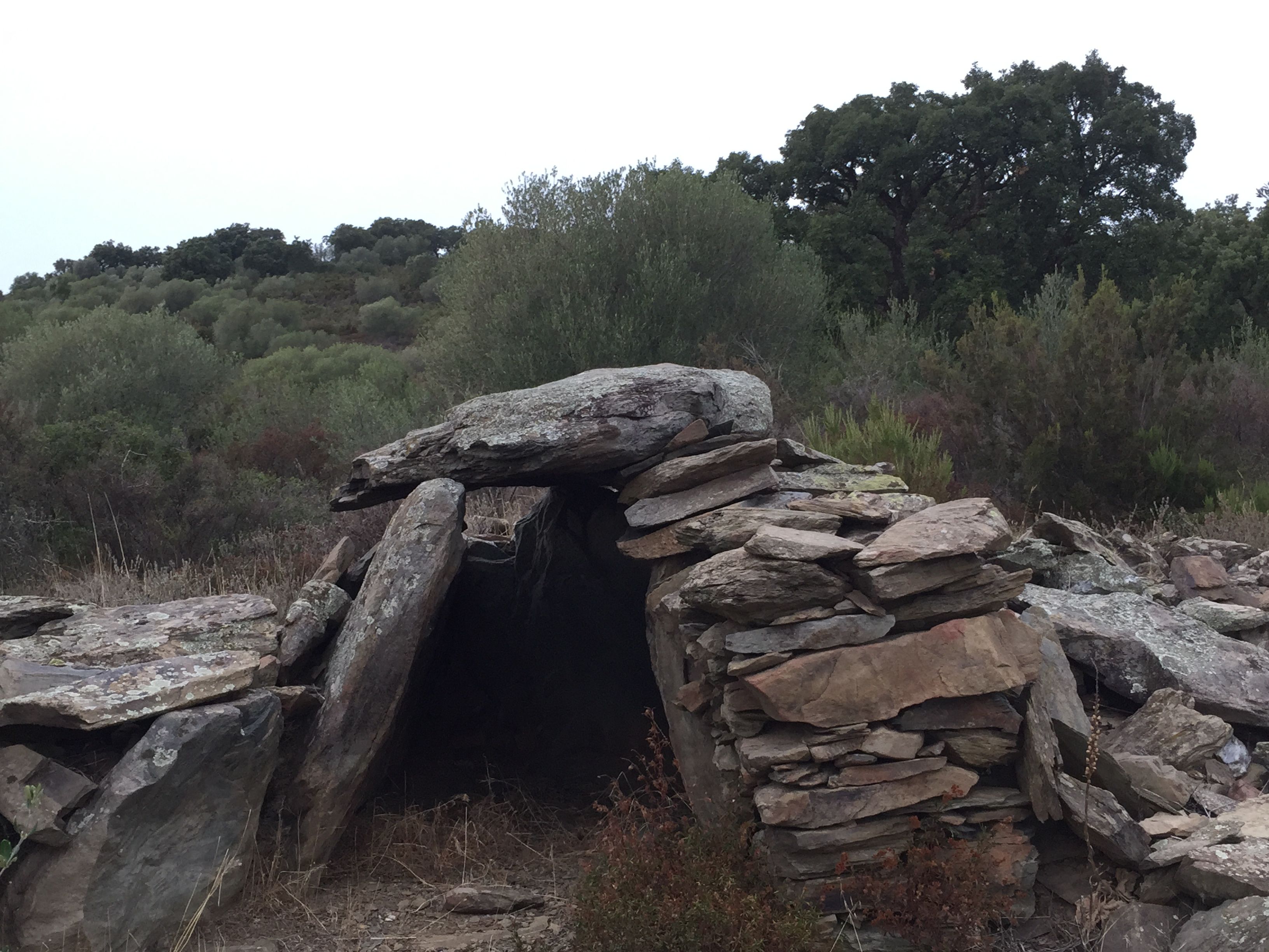 As with all dolmens – burial chambers are called dolmens hereabouts – only when you find it do you realise it could only ever have been built here, in this spot, that it occupies its space so perfectly not only because it has been here for so long, around five thousand years – but that it was created here because of the space it occupies. Habitus of the dead: perfect symbiosis with landscape. In a dig here in in 1979 they found a knife of brown silex, beads of sandstone, a turquoise pendant and several ceramic fragments.