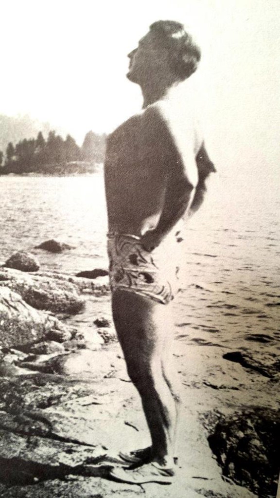 Among the many photographs of the writer posing, glass or bottle in hand, one shows him holding a mirror, reflecting his own image as he is being photographed; and this inevitably leads to the question: why do so many of the photos of Lowry – including those on the dust jackets of books about him – show the writer shirtless, dressed in bathing shorts, staring at the camera in a manner at once glazed and pompous, trying to make an impression with his meagre moustache and his chest pushed out like a bantam cock, as in the often-reproduced photo of Lowry at Burrard Inlet? Why so many photos of a half-naked Lowry? And when we get past the bared torso and the chest hair and the focus on the face – the one on the back cover of the Penguin Modern Classics edition of Under the Volcano – there is something both arrogant and vapid and fearful in those cold, clear eyes. The gaze is, we might surmise, intended to be piercing and riveting, but our attention is distracted by the sparse filaments of the faint moustache, the suggestion of vulnerability in the chin and the plump cheeks, a vaguely satyric pointedness to the ears; in fact what the portrait suggests more than anything else is that the sitter knows that he is meant to be there, but is unfortunately elsewhere, unobtainable, or more likely nowhere, waiting for this to be over with so he can go get another gin. More gin, buckets-full if at all possible, rivers-full, oceans-full of gin. This fantasy, which I am attributing to Lowry, originates in the Consul’s delirious outburst in Under the Volcano, when he attempts to recall an earlier life in Granada, Spain: