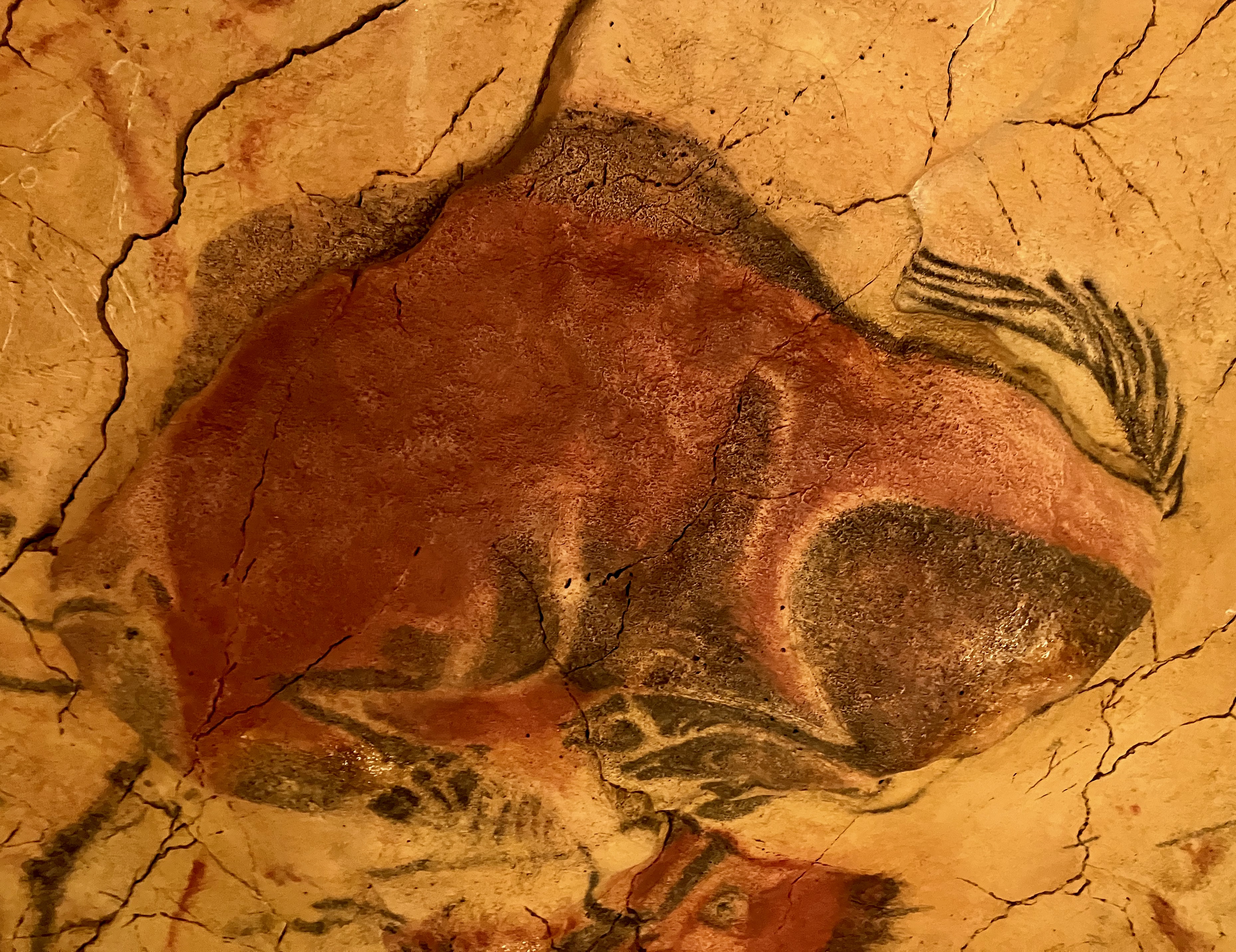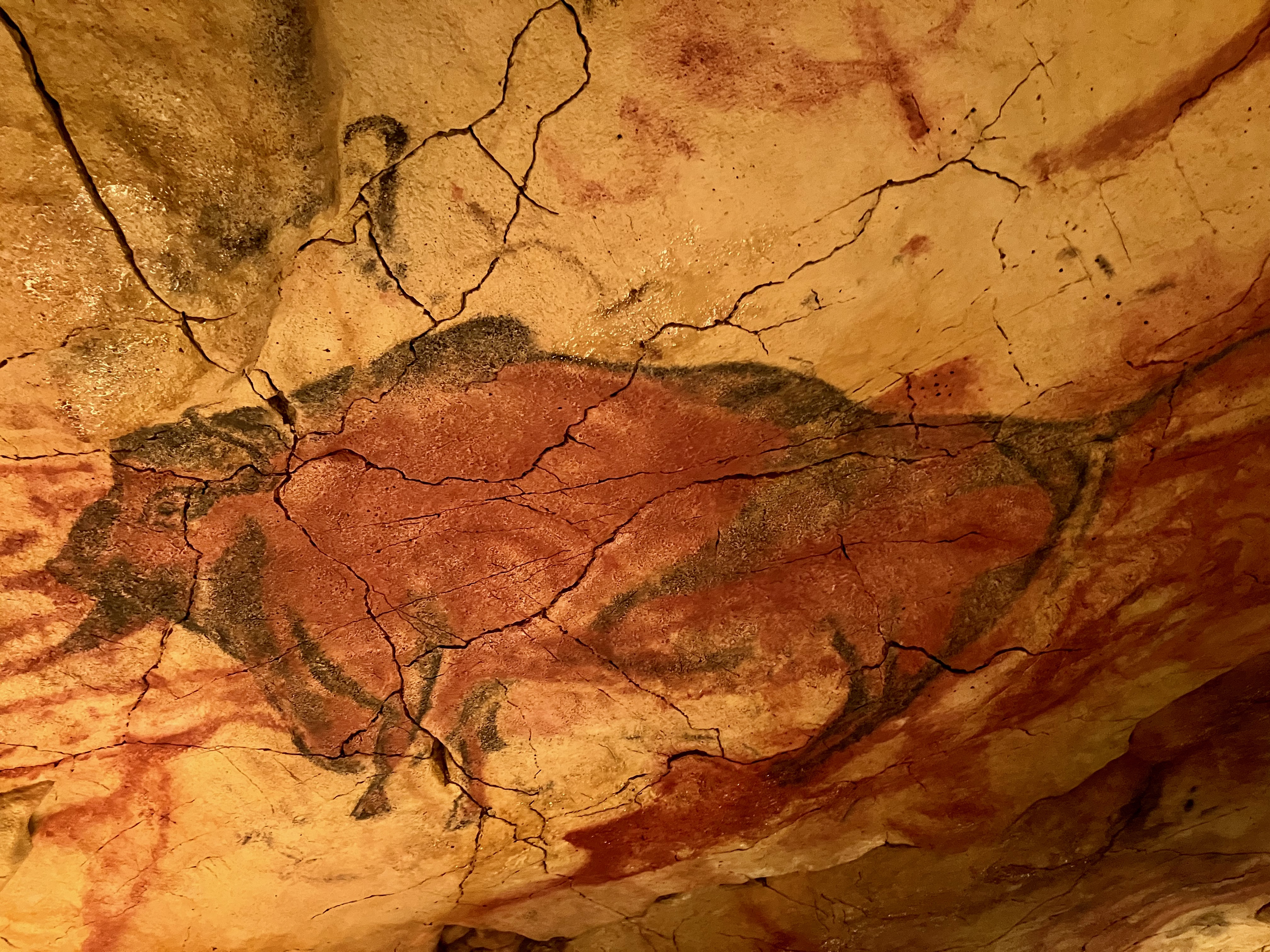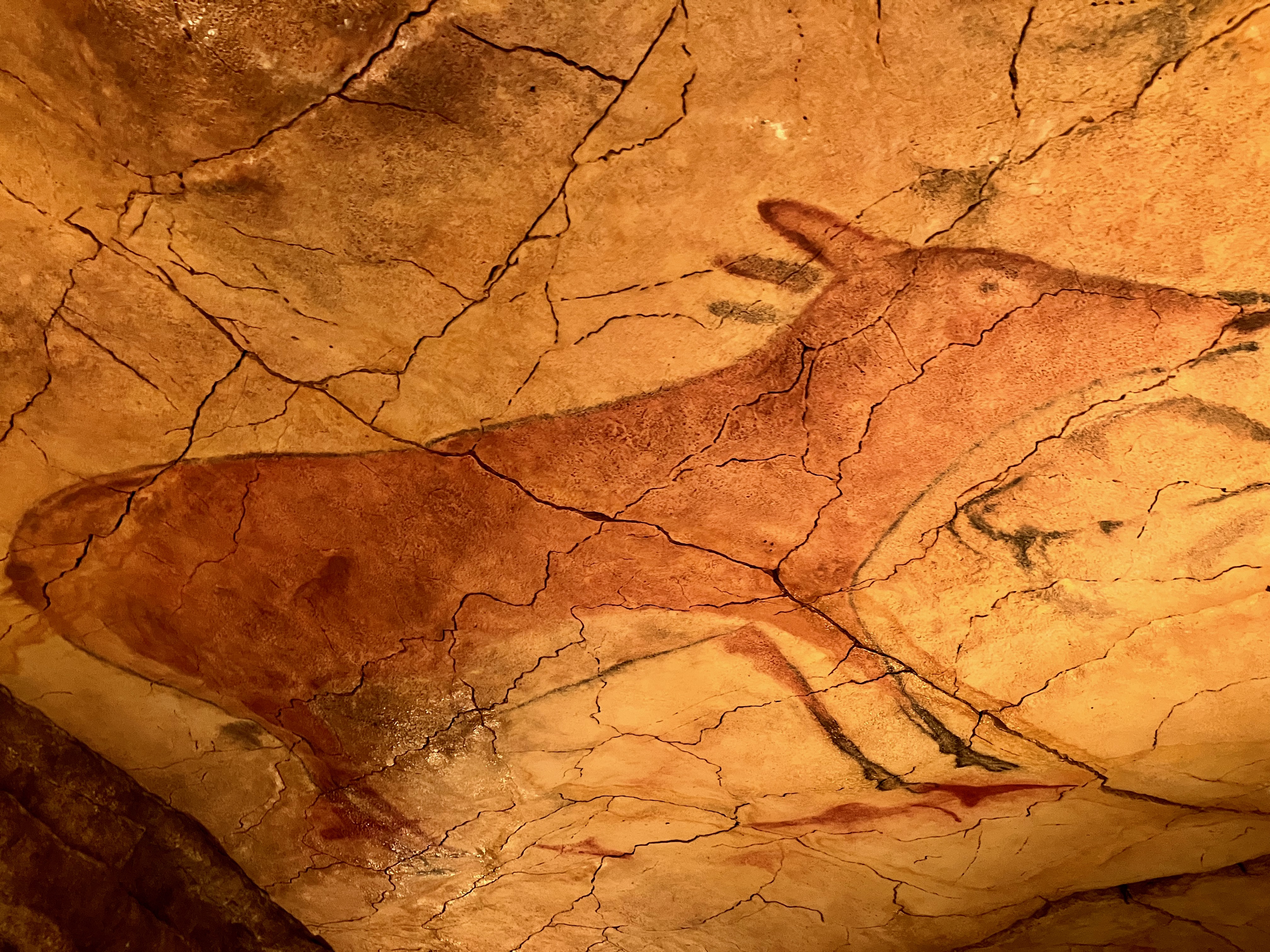 We set out in bright midday sunshine, the storms of last night blown away by the clean Atlantic breeze, and after visiting the museum complex, waited our turn to join the guided tour. Compared with the layout of the Lascaux replica — which copies the descent through the cave in every detail — the Altamira version was spoiled somewhat by the modern gangways and the crowding of one group upon another of visitors. But once we reached them, after a short descent, the effect of the paintings themselves was exhilarating. The ceiling of the reproduction cave is quite low and, of course, we were free to photograph them. I caught a selection of images.