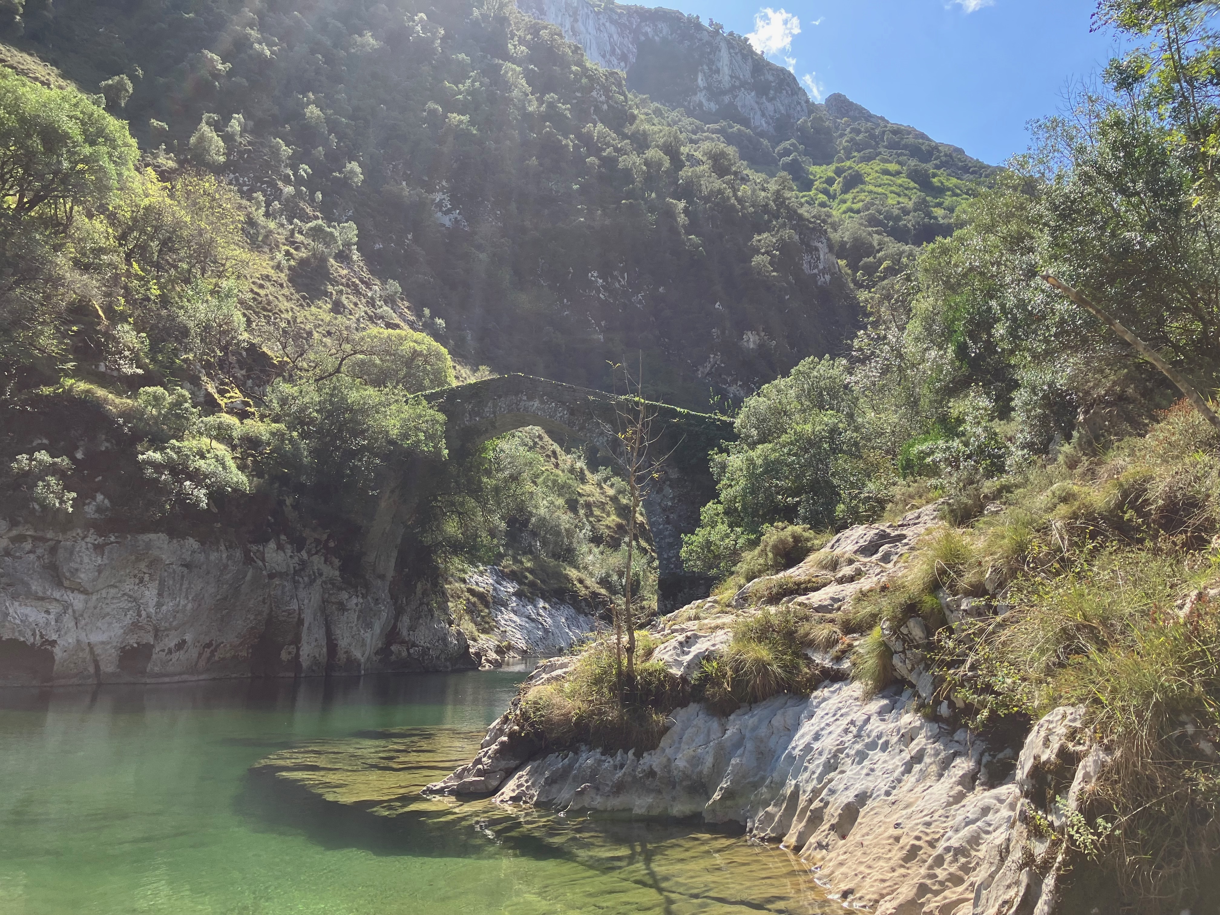 The next morning we set off into Asturias, along a winding mountain road. In search of a picnic spot midway, we happened upon a medieval bridge called Puente La Vidre, which spans the diaphanous waters of the Río Cares. There was no one around and I took an icy swim. Next stop: the Picos de Europa and Covadonga.