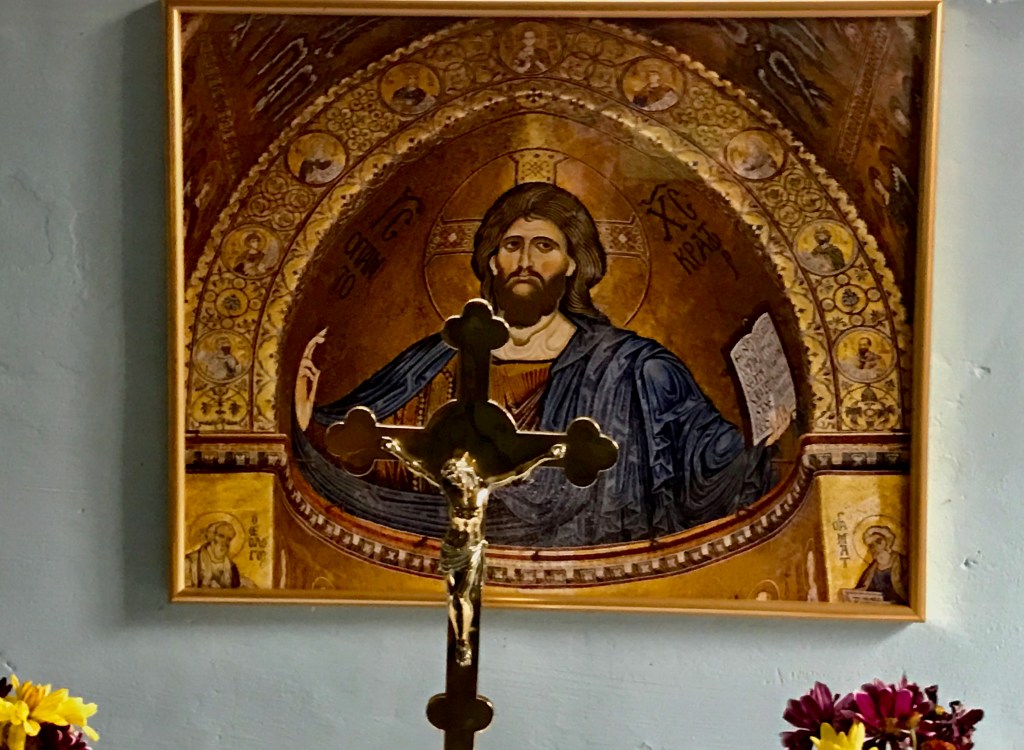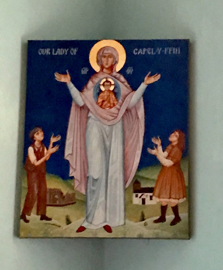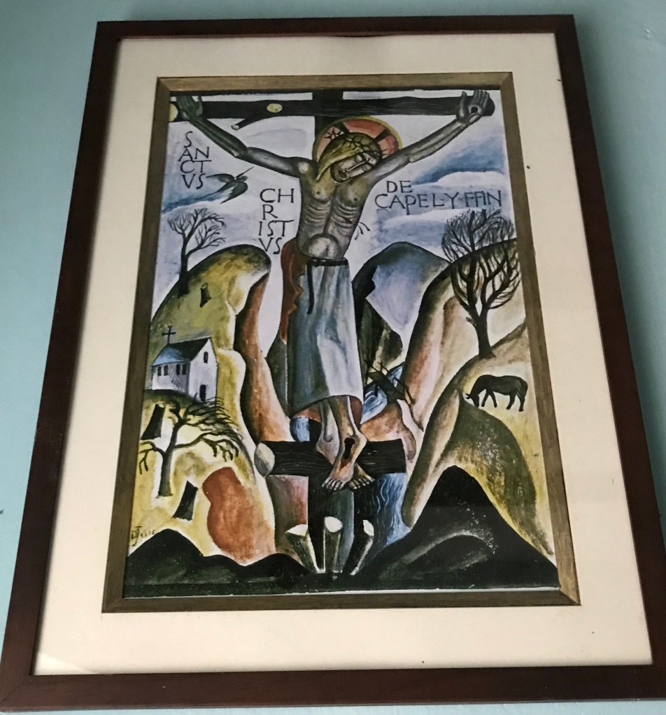 Although the name Capel-y-Ffin is often associated with the idiosyncratic Catholicism of Eric Gill and David Jones (and I will return to them in another post), the hamlet is also home to both a small Anglican church and a Baptist chapel, which lie almost side by side in quiet rivalry. In Wales, according to the old joke, there is always ‘the other place’, the one you don’t go to. Curiously, considering the number of times I have passed through, I had never ventured into either of them until a couple of weeks ago, when I visited both. The little church of St Mary the Virgin, as Kilvert wrote, ‘squats like a stout grey owl among its seven great black yews’, and venturing inside, it feels almost as if I have entered one of those tiny sanctuaries hidden away in the Greek mountains, because the art work has a decidedly Orthodox flavour. There is also a David Jones hanging by the staircase, to the right of the door. Or should I say a copy, or print of a David Jones, as the Tate in London claims to own the original.