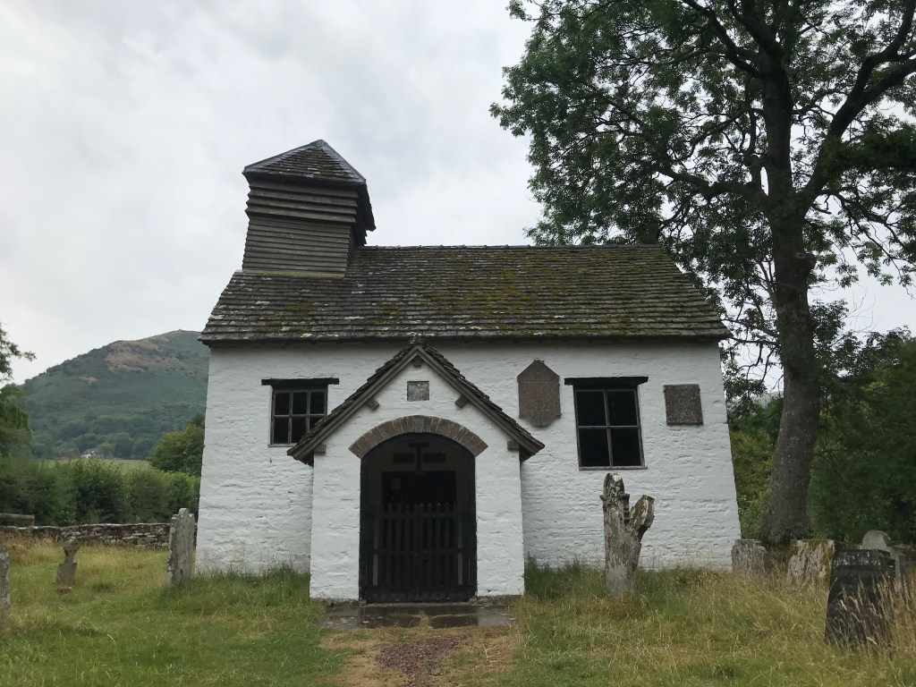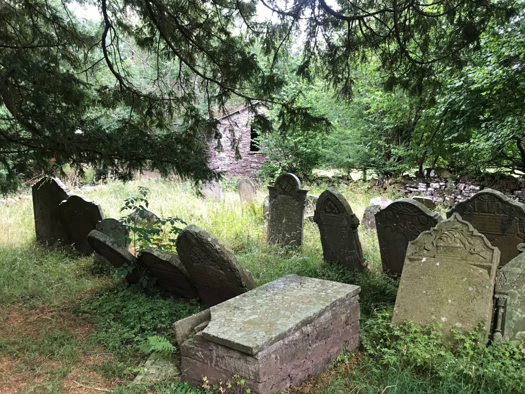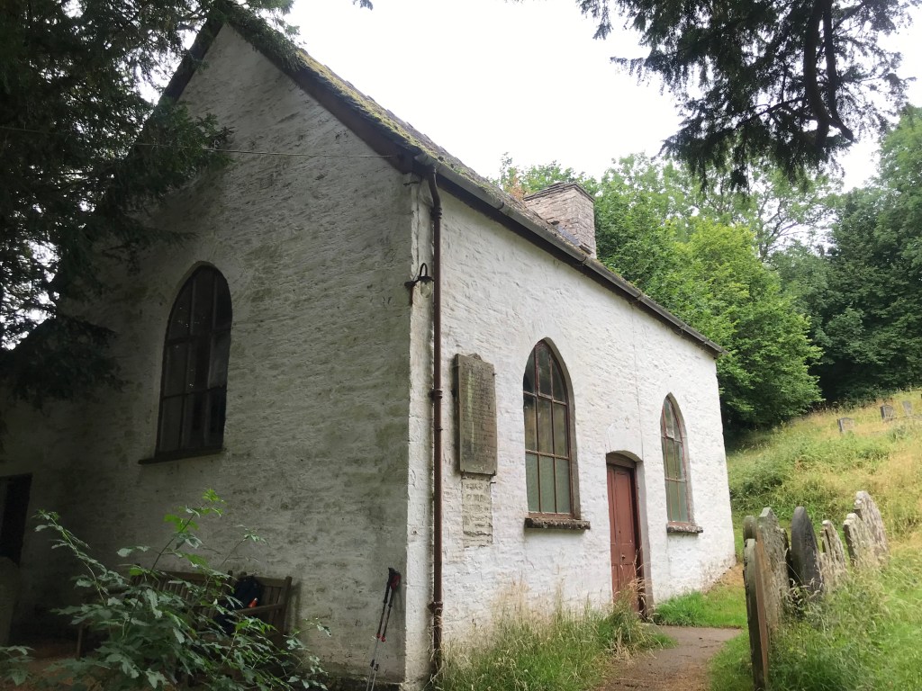 My route now follows the Offa’s Dyke path leading towards Hatterall Hill, with the Olchon Valley to my left. I follow it with tiring footsteps in the persistent drizzle, and only when I come to the turning off point, two miles south, does the weather clear. The unexpected  sunshine adds a spring to my step, and I descend rapidly down a steep path through shoulder-high ferns, almost to the valley road, but turn off just before, along a pretty, wooded track, one of those paths best encountered in the early evening light of a summer’s day. And before joining the valley road, on the right, stands the Baptist Chapel. The building itself is closed up, and I can’t go in, but there is the demure and mossy graveyard, and a most hospitable bench, in which I can sit and take it all in. It is a  wonderfully tranquil spot, beside an especially imposing yew tree. There are worse places to spend eternity, I imagine: at least for this version of you, either in this or whichever world you find yourself.