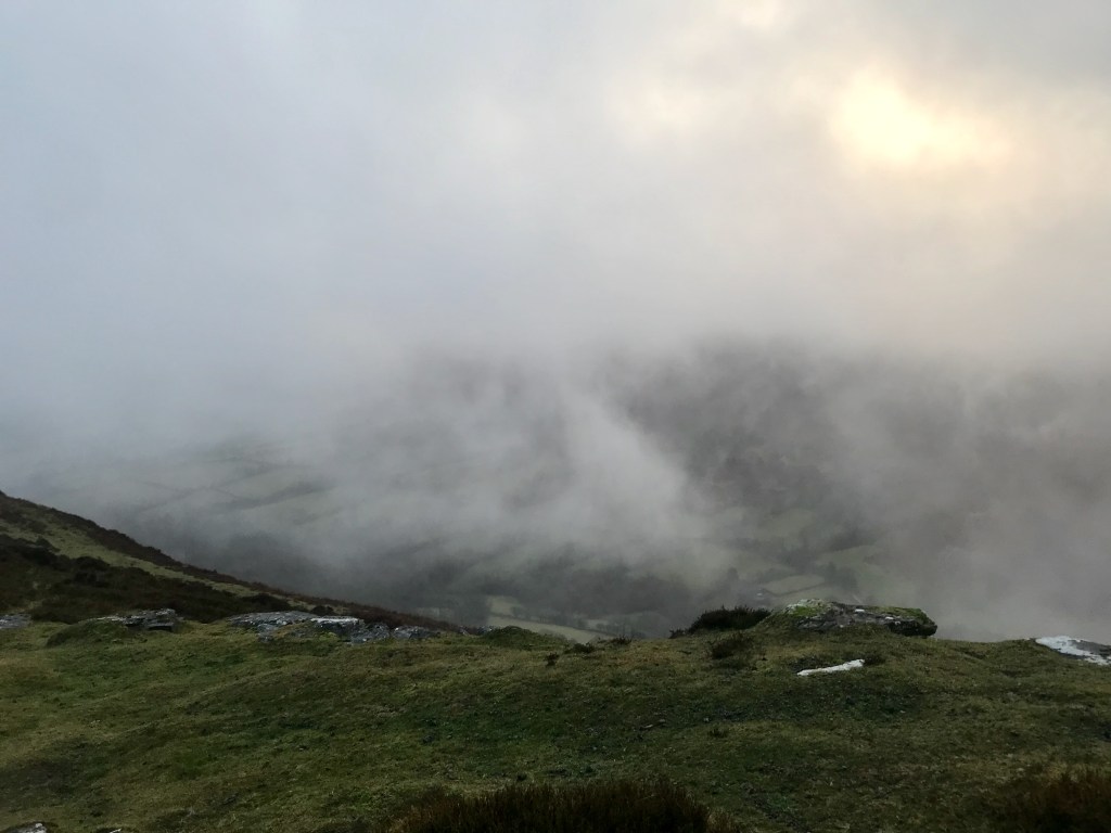 And as you sit on a rock and sip tea from your thermos and look down over the valley towards the Sugar Loaf, which sits in the distance like a Welsh Mount Fuji, it seems as though you could step forward and plunge into this viscous sea of white, beneath which nothing is visible and which, it seems, might be nothing more nor less than the Cloud of Unknowing, or, as it was spelled in the fourteenth century, The Clowde of Unkowyng.