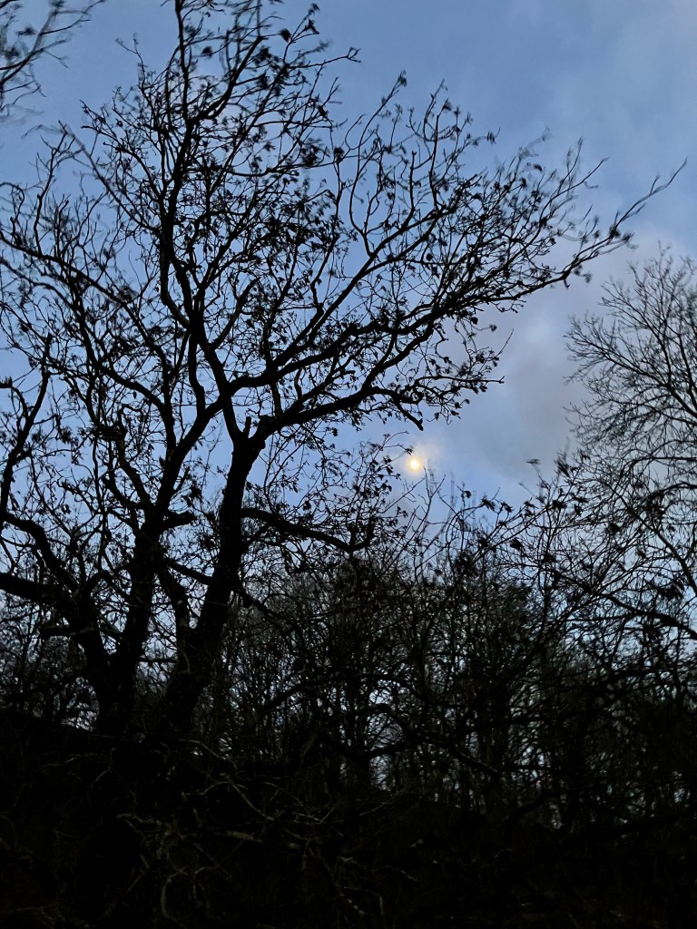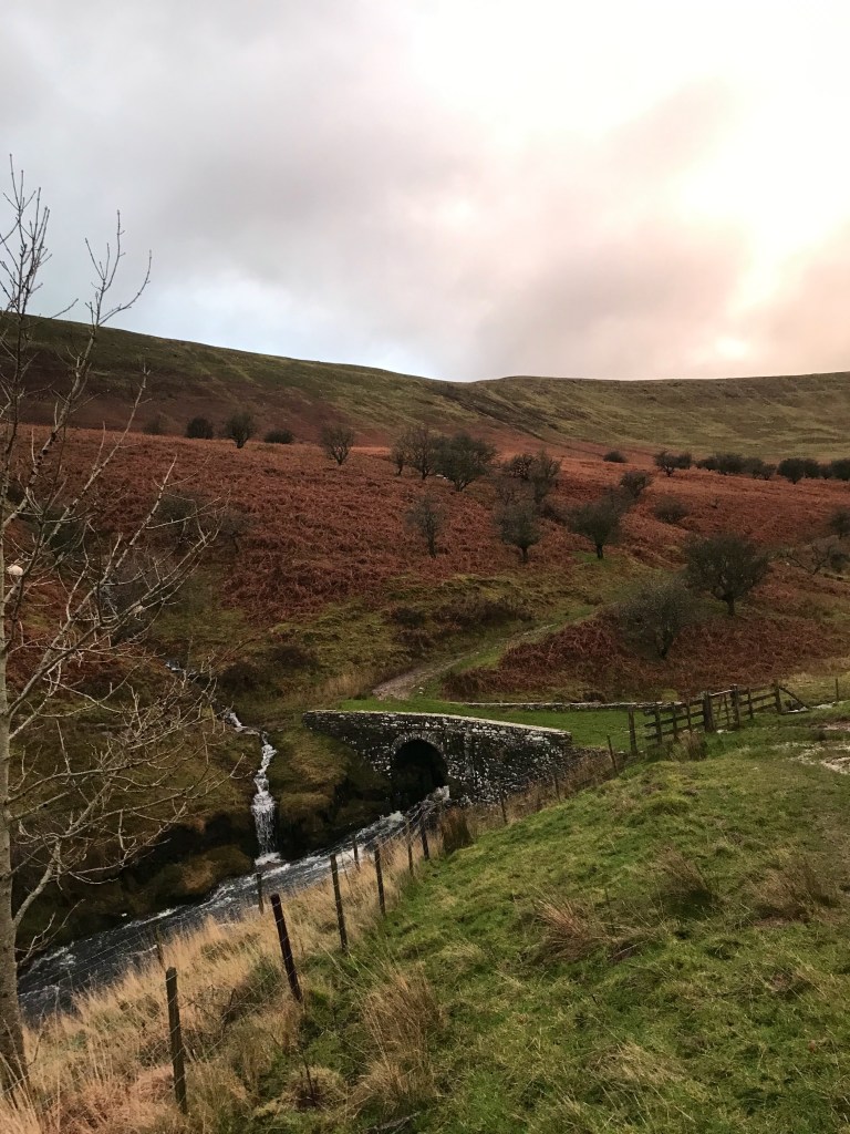 Night is falling, and I have no desire to return to the car. I wander and I muse and I track my musings, vaguely, though with less and less concern or even interest: it is impossible to follow the jumping bean antics of one’s train of thought, pointless to try and track the fugitive self as it careens through thought and images, smashing up against the wall of intellect, or rationality. And so, irrationally, rather than follow the rough track to join with Macnamara’s way, just above the Tal y Maes bridge, I decide to go down to the Grwyne fechan, though I know I will not be able to cross it without wading, the stream will be in full flow with all these winter rains, but never mind, I will face that obstacle when I get there: I want to hear the rush of water and see the moon through the branches of the trees at the river’s edge. It is as if I am drawn by some mysterious force to the water, that I need to cross the river there, rather than upstream, at the Tal-y-maes bridge. And it is only when I approach that I understand a little why that might be. I had almost forgotten, but we used to come here for picnics when my daughters were small; and further back, if I am not mistaken, I believe I came here myself as a child for a picnic with my parents, but I cannot be sure; it may be a case of me confusing my own childhood with the childhood of my children. In any case, once I have navigated the boggy ground near the river, I seek out a suitable place to cross. There is not one, of course, as I knew there wouldn’t be.