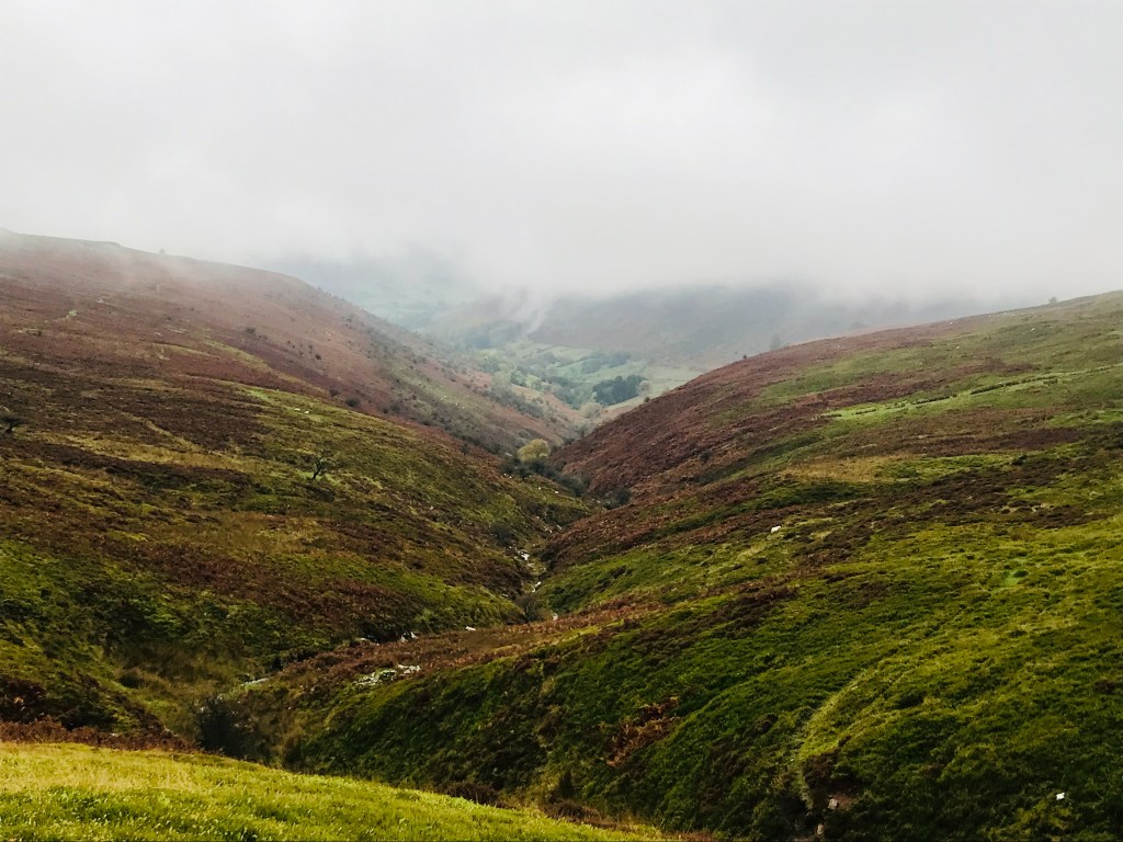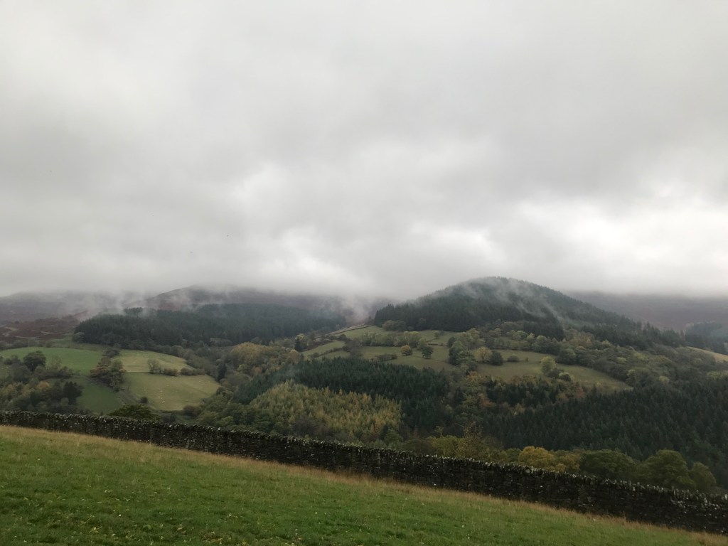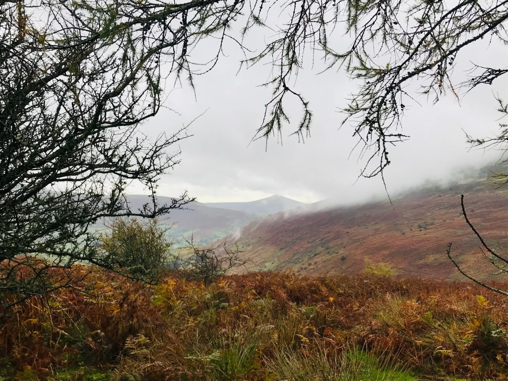 Deep into autumn, with the rich russet or burnt sienna of the ferns, and the grass still so green, with streaks of cloud racing up the valley to our left and, as the mist thickens, an overlay of something more remote and altogether wintry. Walking, something like a refrain begins to emerge, almost a credo about the self, with which I have been struggling all this year, during various walks around these hills, mulling over my reading of certain philosophers and neuroscientists on the notion of core identity. Not that I’ve learned much.
