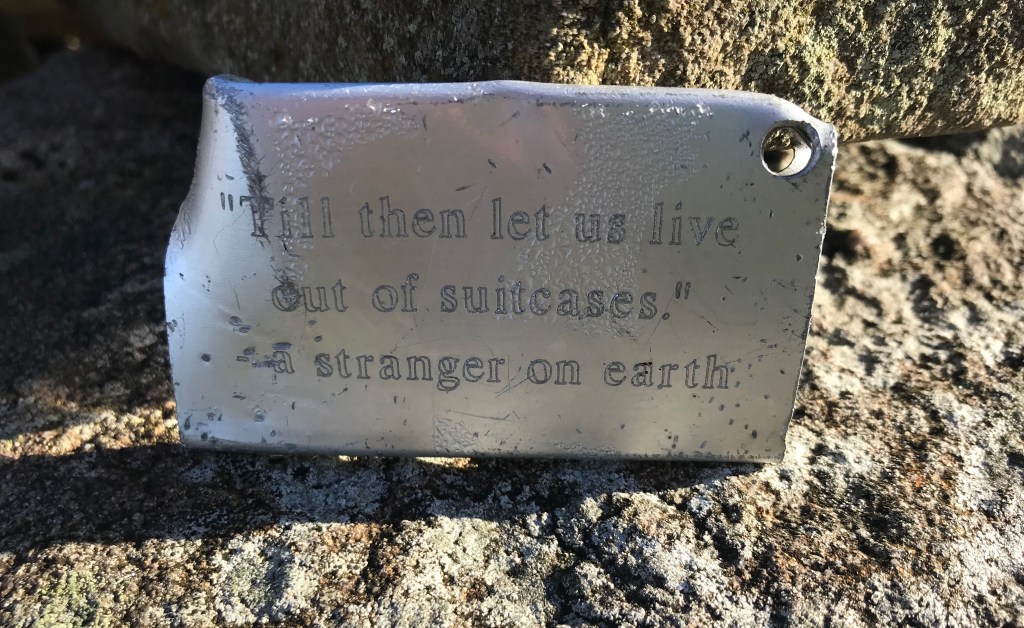 It is only when you stand to pick up your rucksack that you notice the little silver tag, which someone has slipped in beneath one of the stones. You retrieve it, and it reads: ‘”Till then let us live out of suitcases.” A stranger on earth.’ You have no idea why anyone would have those words engraved on a small piece of metal and leave it in a pile of stones on a hillside in the Black Mountains. A serendipitous discovery, or pure chance?