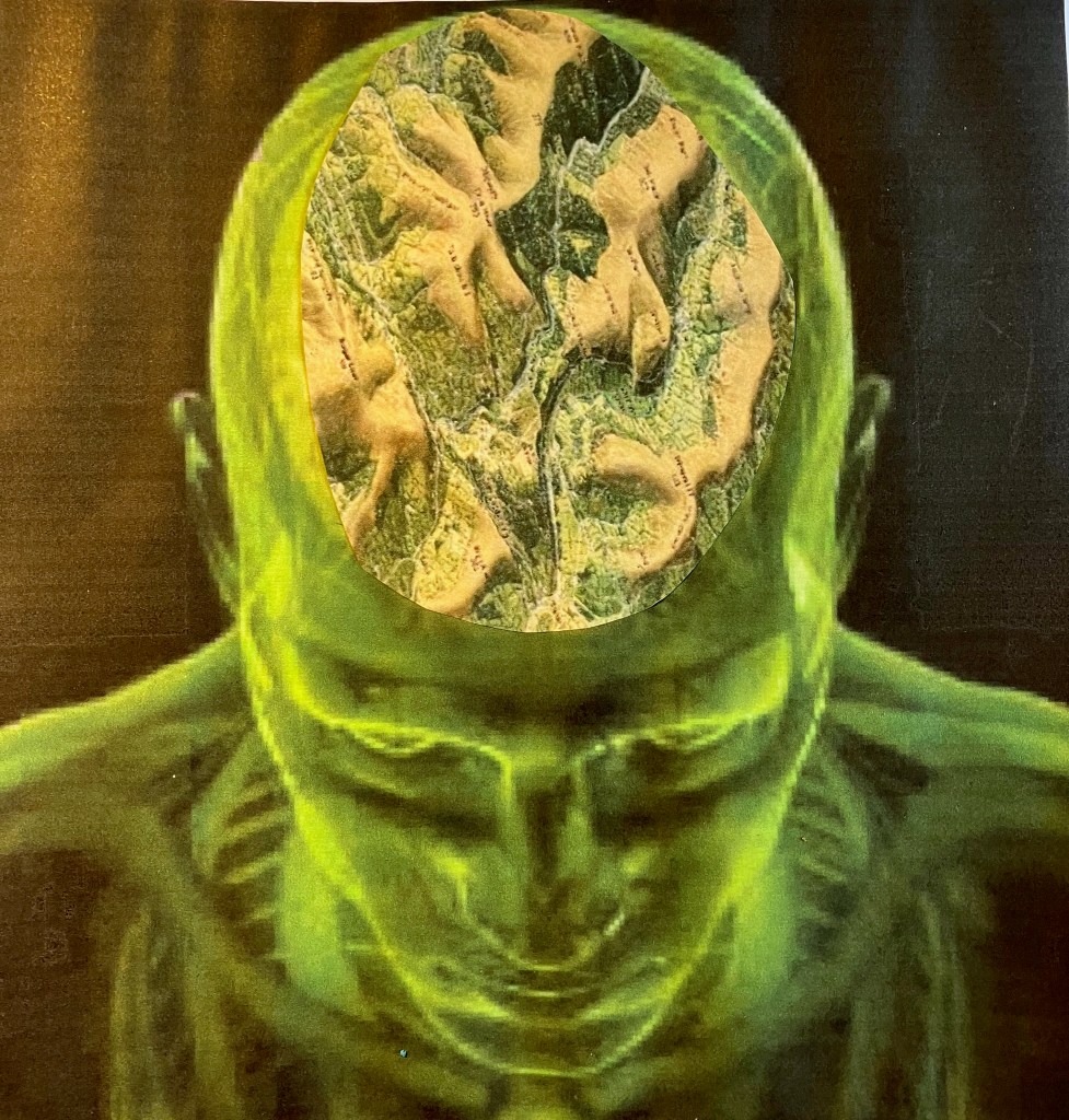 In this no man’s land of the Mynyddoedd duon, the geography is sometimes malleable, shifting: it is the geological equivalent, I think, of the brain’s neuroplasticity, which has been defined in the Journal Frontiers in Cellular Neuroscience, as ‘the ability of the nervous system to change its activity in response to intrinsic or extrinsic stimuli by reorganizing its structure, functions, or connections.’ That’s it: the Black Mountains as a human brain! It is kind of shaped like one, don’t you think? With the Grwyne Fawr valley forming the central furrow, the left side comprising Grwyne Fechan, Cwm Banw, Pen Allt Mawr and Pen Cerrig Calch, the right side comprising everything to the east — from Darren yr Esgob, across the Ewyas Valley, Offa’s Dyke ridge, the Cat’s Back etc. And what if it reorganises its structure by minute degrees according to the external stimulus of quantum measurement — or of human observation? The relief map on my bathroom wall now makes more sense: it represents the territory of the Black Mountains as a massive brain, through which we might walk, and, who knows, have our minds truly blown.