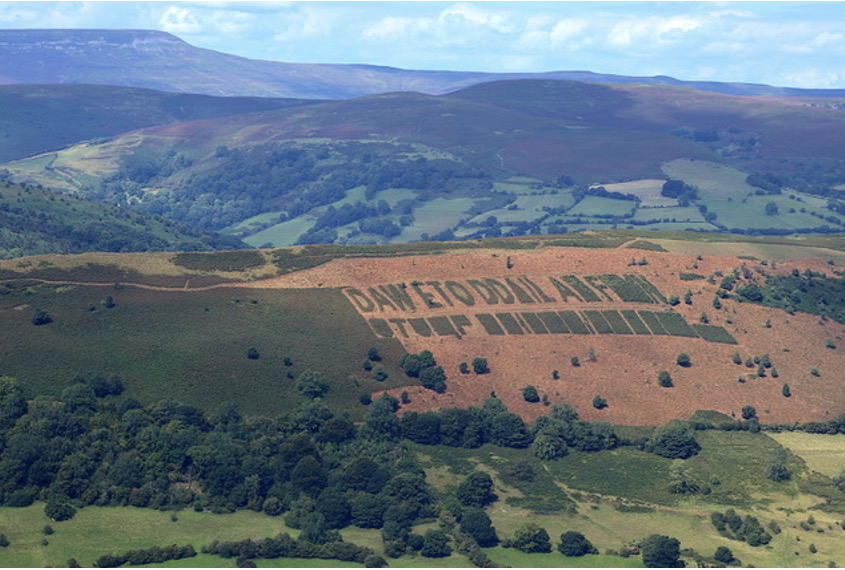 I have driven past Bryn Arw countless times on my way to the Vale of Ewyas and Llantony, but only became aware of it as a separate entity about three years ago when a graffito appeared on the hillside, carved, as it were, into the ferns:Daw eto ddail ar fryn’ which means ‘There will be leaves on the hill again.’ The line is a play on words, intentionally mis-quoting a line of poetry popular across Wales during lockdown – ‘Daw eto haul ar fryn’, meaning ‘There will be sunshine on the hill again’. The words were carved into the hillside by a local charity called ‘STUMP UP FOR TREES’ / ‘CEINIOGI’R COED’ who are intent on an ambitious replanting programme that will help improve biodiversity in the area. They hope to plant one million trees on hillsides and marginal agricultural land across the area.