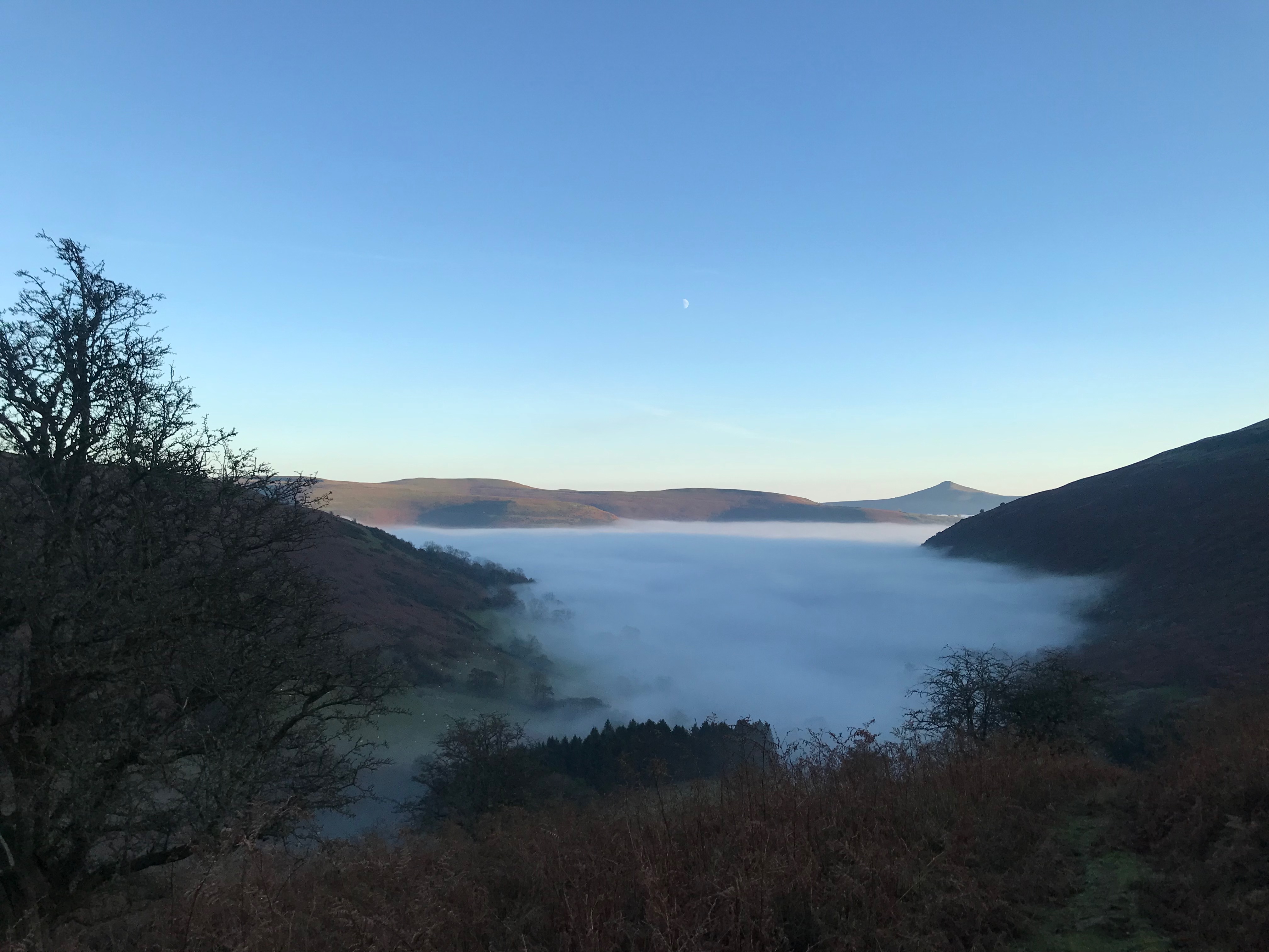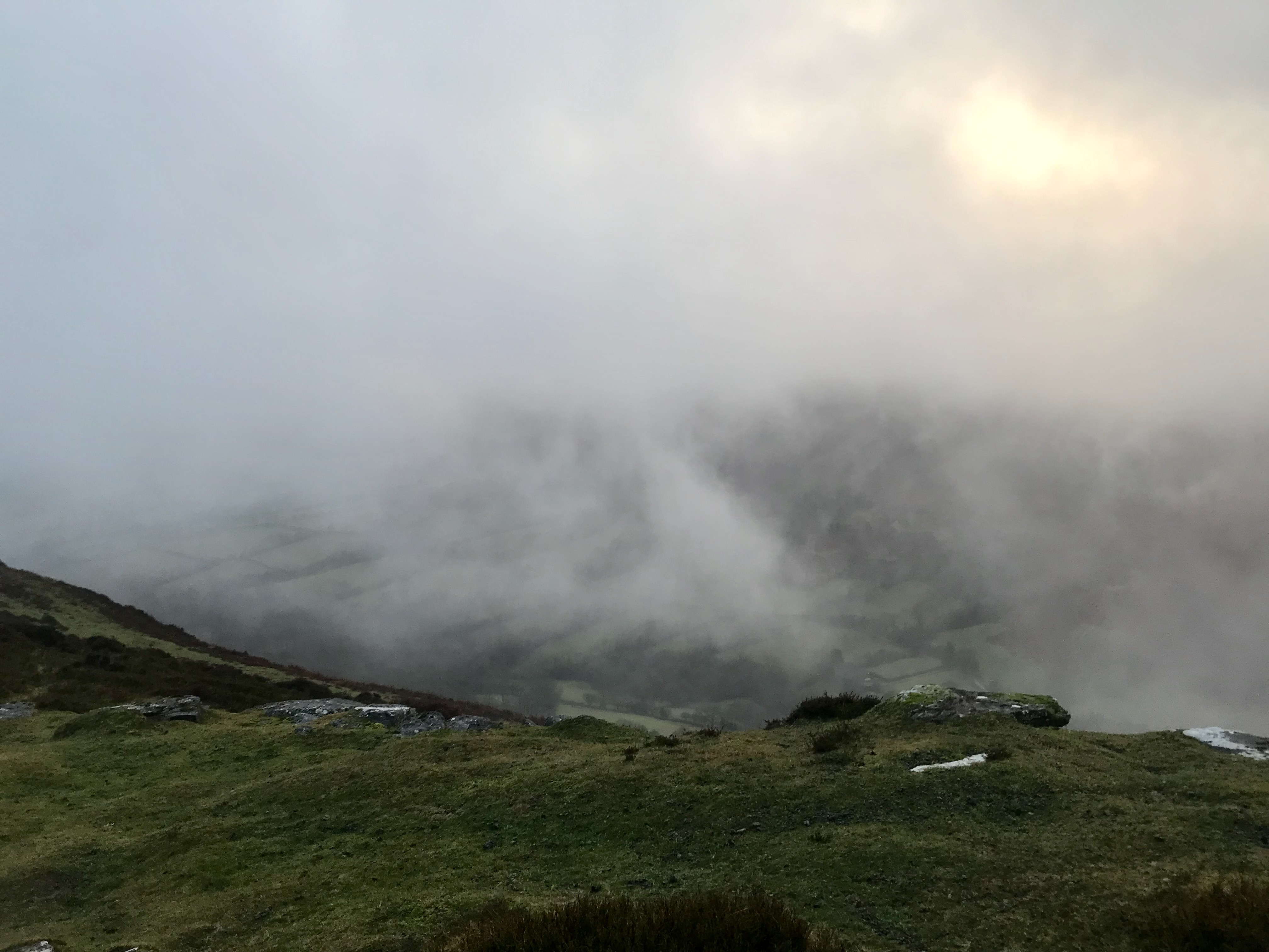 And as you sit on a rock and sip tea from your thermos and look down over the valley towards the Sugar Loaf, which sits in the distance like a Welsh Mount Fuji, it seems as though you could step forward and plunge into this viscous sea of white, beneath which nothing is visible and which, it seems, might be nothing more nor less than the Cloud of Unknowing, or, as it was spelled in the fourteenth century, The Clowde of Unkowyng.