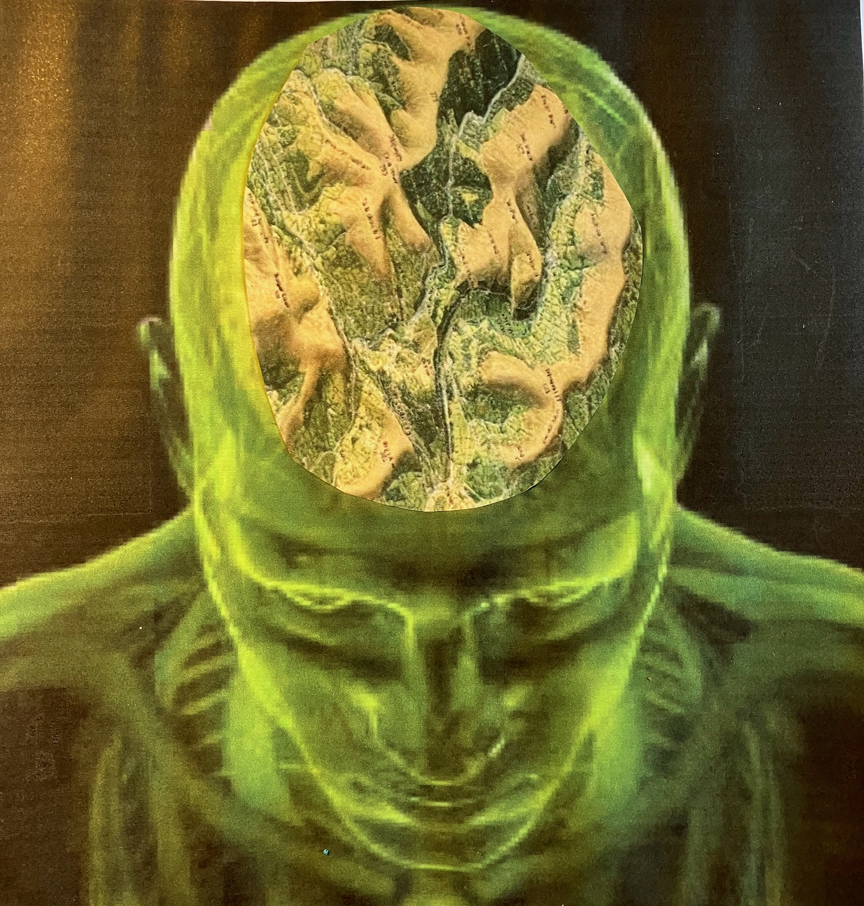 In this no man’s land of the Mynyddoedd duon, the geography is sometimes malleable, shifting: it is the geological equivalent, I think, of the brain’s neuroplasticity, which has been defined in the Journal Frontiers in Cellular Neuroscience, as ‘the ability of the nervous system to change its activity in response to intrinsic or extrinsic stimuli by reorganizing its structure, functions, or connections.’ That’s it: the Black Mountains as a human brain! It is kind of shaped like one, don’t you think? With the Grwyne Fawr valley forming the central furrow, the left side comprising Grwyne Fechan, Cwm Banw, Pen Allt Mawr and Pen Cerrig Calch, the right side comprising everything to the east — from Darren yr Esgob, across the Ewyas Valley, Offa’s Dyke ridge, the Cat’s Back etc. And what if it reorganises its structure by minute degrees according to the external stimulus of quantum measurement — or of human observation? The relief map on my bathroom wall now makes more sense: it represents the territory of the Black Mountains as a massive brain, through which we might walk, and, who knows, have our minds truly blown.
