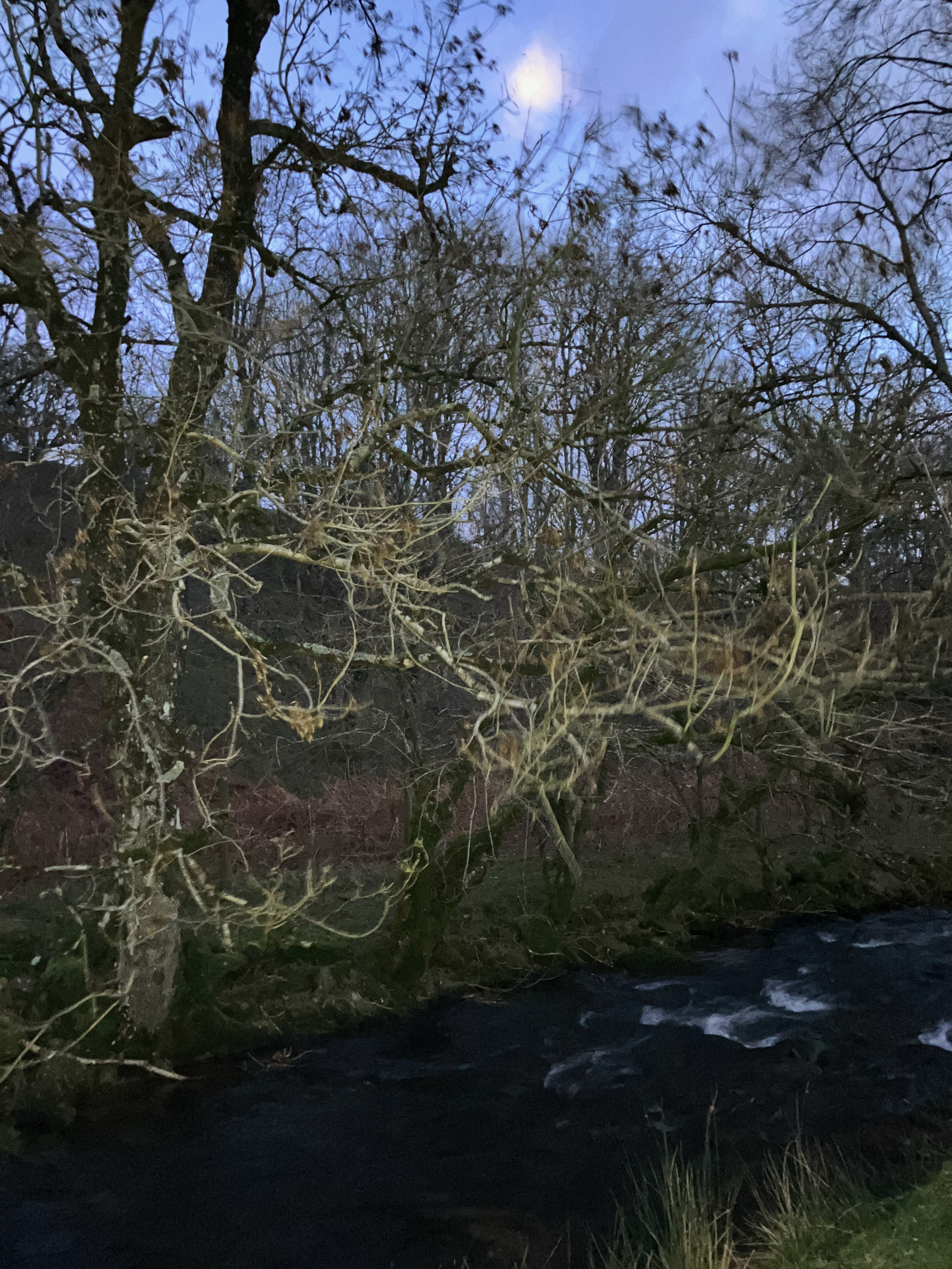 Night is falling, and I have no desire to return to the car. I wander and I muse and I track my musings, vaguely, though with less and less concern or even interest: it is impossible to follow the jumping bean antics of one’s train of thought, pointless to try and track the fugitive self as it careens through thought and images, smashing up against the wall of intellect, or rationality. And so, irrationally, rather than follow the rough track to join with Macnamara’s way, just above the Tal y Maes bridge, I decide to go down to the Grwyne fechan, though I know I will not be able to cross it without wading, the stream will be in full flow with all these winter rains, but never mind, I will face that obstacle when I get there: I want to hear the rush of water and see the moon through the branches of the trees at the river’s edge. It is as if I am drawn by some mysterious force to the water, that I need to cross the river there, rather than upstream, at the Tal-y-maes bridge. And it is only when I approach that I understand a little why that might be. I had almost forgotten, but we used to come here for picnics when my daughters were small; and further back, if I am not mistaken, I believe I came here myself as a child for a picnic with my parents, but I cannot be sure; it may be a case of me confusing my own childhood with the childhood of my children. In any case, once I have navigated the boggy ground near the river, I seek out a suitable place to cross. There is not one, of course, as I knew there wouldn’t be.