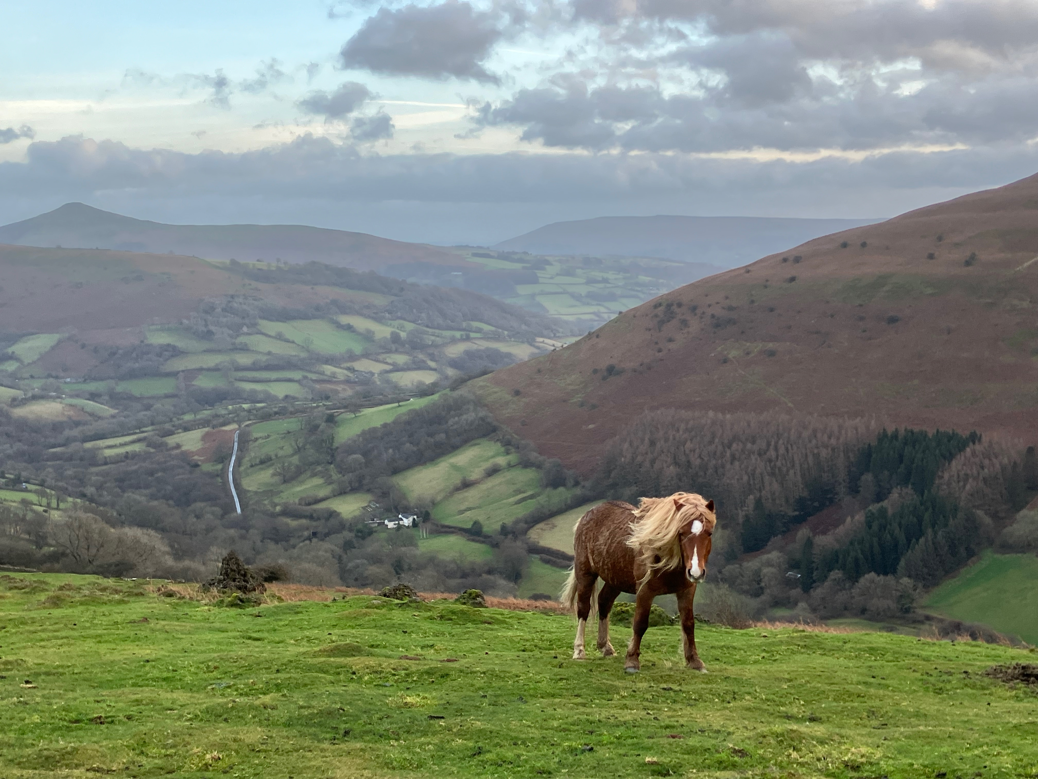 Sometimes things fall into place in a way that suggests an omniscient narrator is writing the script, and you are merely a pawn in the plot. On a hill named Pen Gwyllt Meirch — the hill of wild horses (or stallions) — you stop beside a string of them as they graze, just as this pair — who have been nuzzling at each other’s necks as you approach, embark on a silent dance, with only the wind as accompaniment. After their exuberant pas de deux, they return to the group, as the others look on.