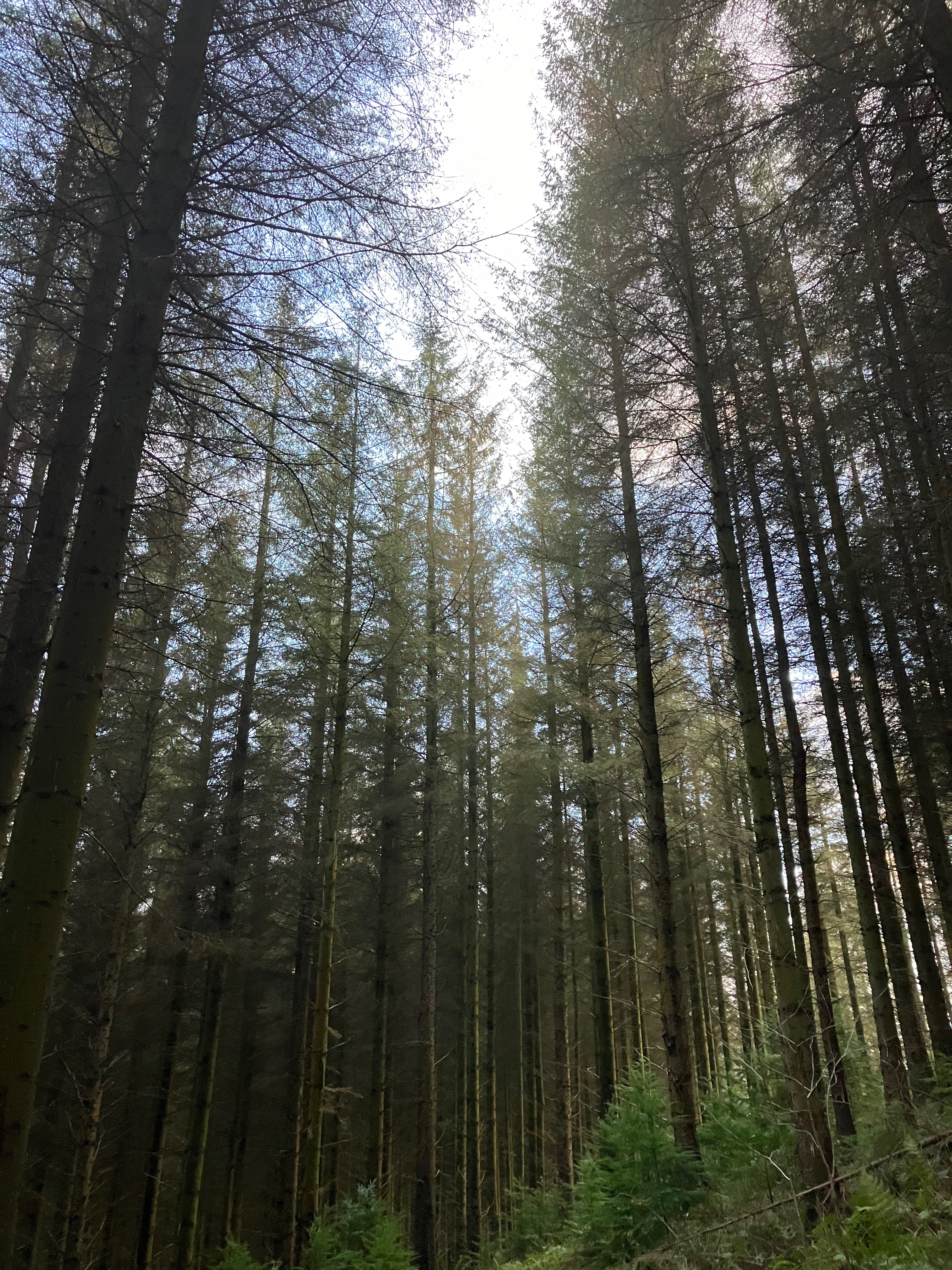 I start up the forestry track on the west side of Cwm Grwyne Fechan. The ground is boggy after days, weeks of rain, and when the track ends, I enter the forest itself, the peaks of the tall pines forming a dome above my head like the cupola of a cathedral. Light filters through, reminding me of the way that those high, stained glass windows in such places of worship were designed to enchant the faithful, light being the trope that forms the core of ‘enlightenment’. We sit (or stand) in awe of such light, and the great Gothic cathedrals mimic nature in this way.